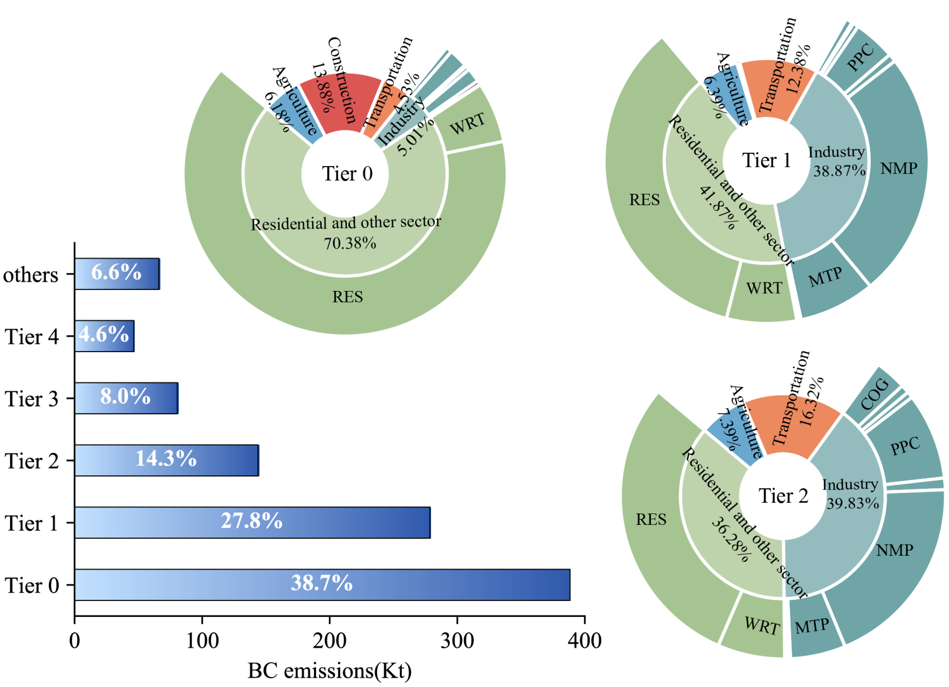 Figure 6. The contribution of different tiers and sectors in the supply chain to BC emissions (the percentage in the histogram is the ratio of the production layer to the total emissions; the percentage in the pie chart is the proportion of major sectoral emissions to the total emissions of the production layer).