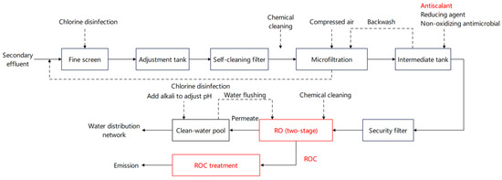 We sourced the ROC for this study from a reclaimed water plant in Beijing that uses a microfiltration-reverse osmosis process and treats secondary effluent from a municipal wastewater treatment plant. A flow diagram of the plant’s processes is shown in Figure 1. The main water quality parameters of the ROC used in this study are shown in Table 1.