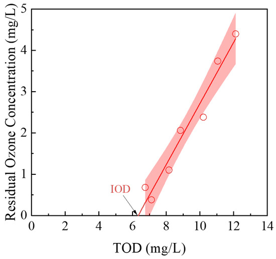 As the ozone reaction time increased, the increase in the TOD per unit time (dTOD/dt) gradually decreased. This indicates that there were fast-reacting substances in the ROC during the initial reaction phase, and the IOD value was 6.3 mg/L.