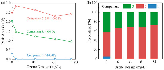 Effect of ozone dosage on chromophore-containing organic compounds with different molecular weights in the ROC. (a) peak area; (b) percentage of each component.