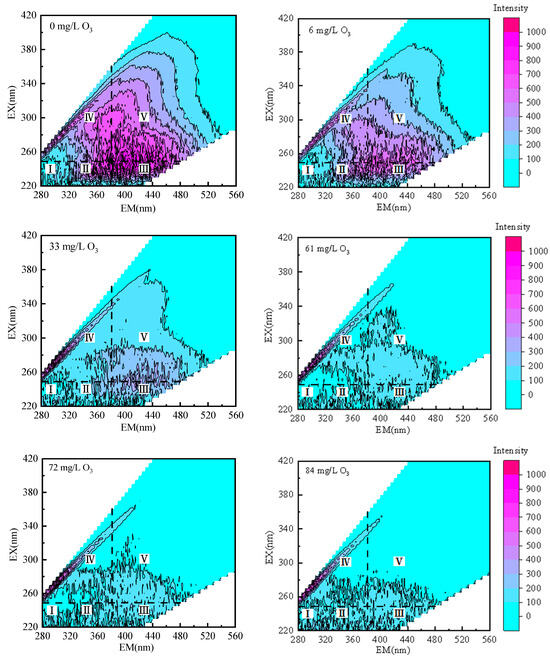 In addition to chromophoric organic compounds, the organic matter in ROC also includes a significant amount of fluorescent organic compounds. The changes in the three-dimensional fluorescence spectra under different ozone dosages are shown in Figure 8. As shown in Figure S5, the ozone caused the total fluorescence regional integration of the three-dimensional fluorescence spectrum of the organic compound in the ROC to decrease from 6.8 × 107 nm2 to 2.2 × 107 nm2, which represented a removal rate of 67.6%.