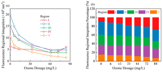 Effect of ozone dosage on organic compounds in different regions of the three-dimensional fluorescence spectrum of ROC. (a) fluorescence regional integration, (b) percentage of fluorescence regional integration.