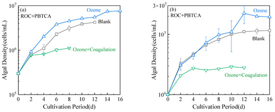 Reverse osmosis concentrate often contains organic phosphonate antiscalants. The phosphorus in the ROC can cause eutrophication of water bodies and lead to algal blooms if left untreated [46,47,48]. We therefore investigated the microalgal growth potential during ozone and ozone/coagulation treatment of ROC containing organic phosphonate antiscalants. Two commonly used organic phosphonate antiscalants, PBTCA and HEDP, were added to the ROC at a dosage of 15 mg/L. Scenedesmus sp. LX1 and Chlorella sp. ZTY4 were used to test the microalgal growth potential.