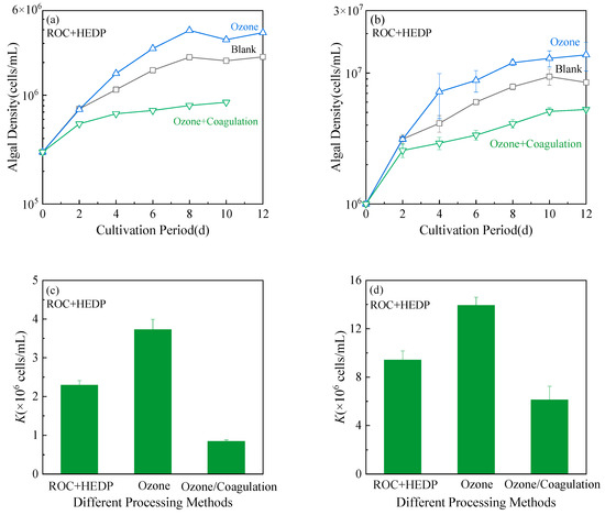 Similarly, the K values were highest in the ROC containing HEDP after ozone treatment. The values for the Scenedesmus sp. LX1 and Chlorella sp. ZTY4 were 3.7 × 106 cells/mL and 1.4 × 107 cells/mL, respectively. The K values in the mixture of ROC and HEDP also decreased after the ozone/coagulation treatment, as shown in Figure 11. The K values for Scenedesmus sp. LX1 and Chlorella sp. ZTY4 were 63.5% and 35.1% lower in the ozone/coagulation-treated ROC than in the untreated ROC, respectively.