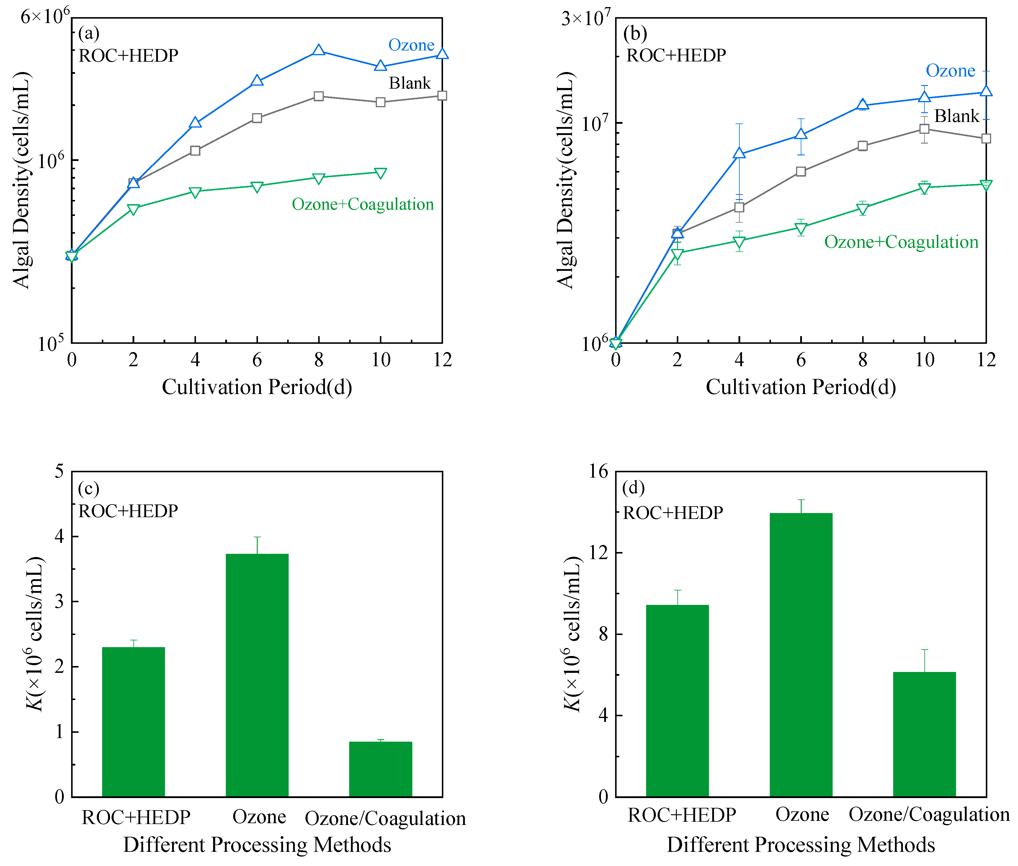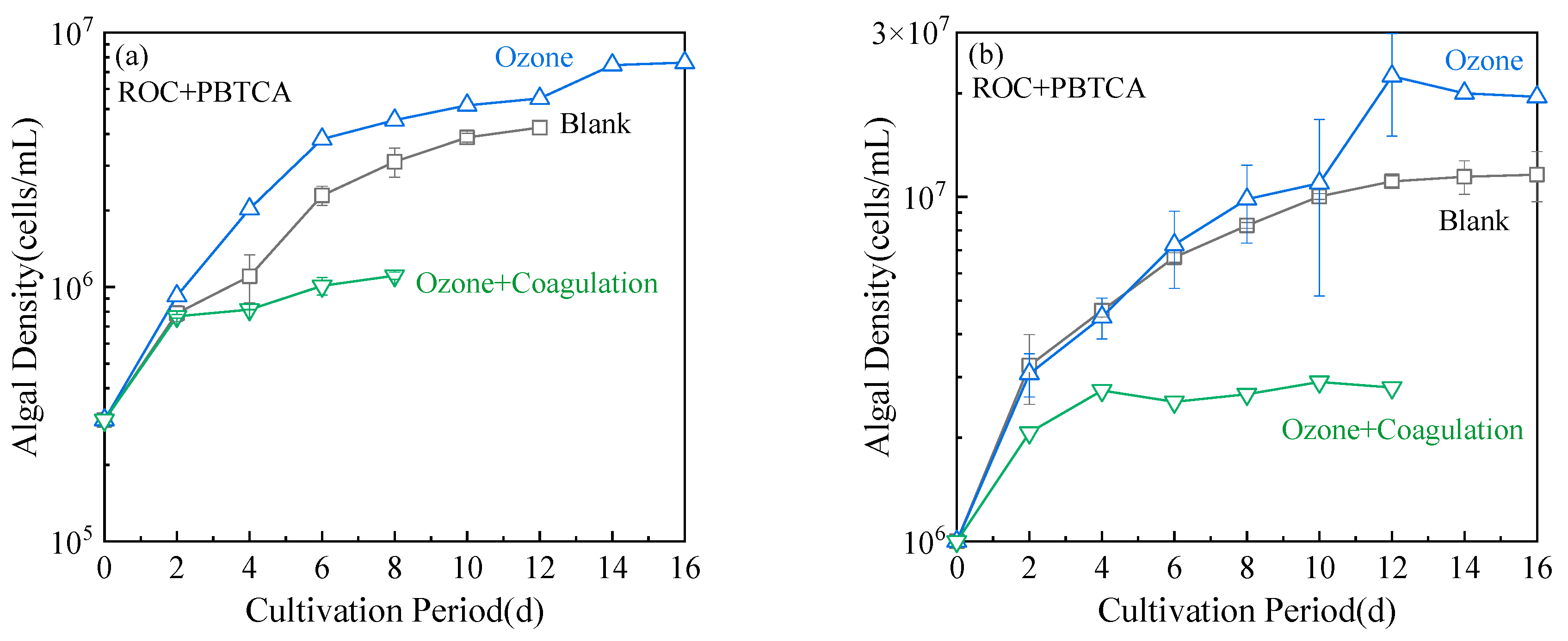 3.6. Changes in the Microalgae Growth Potential of ROC by Ozone/Coagulation