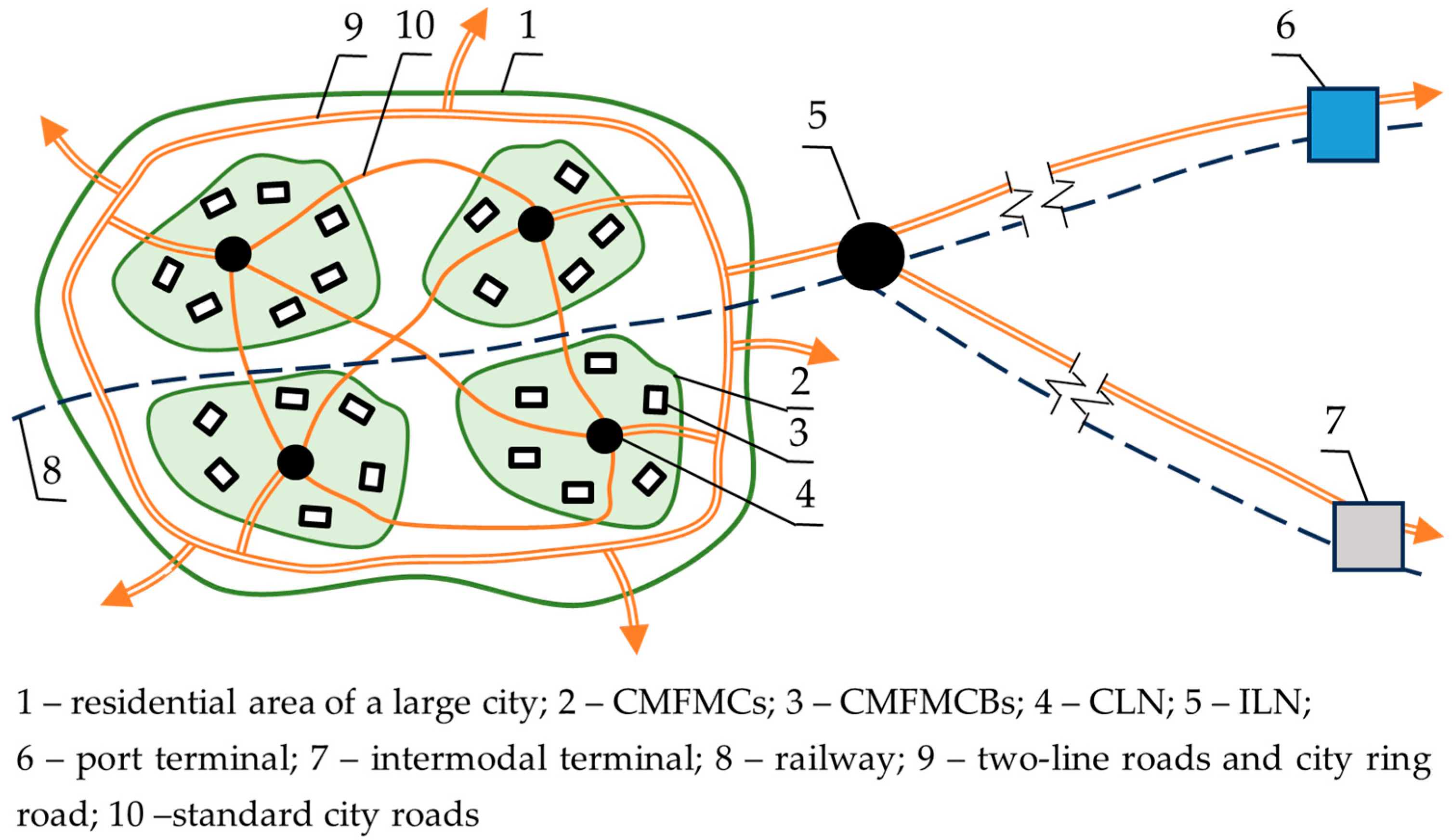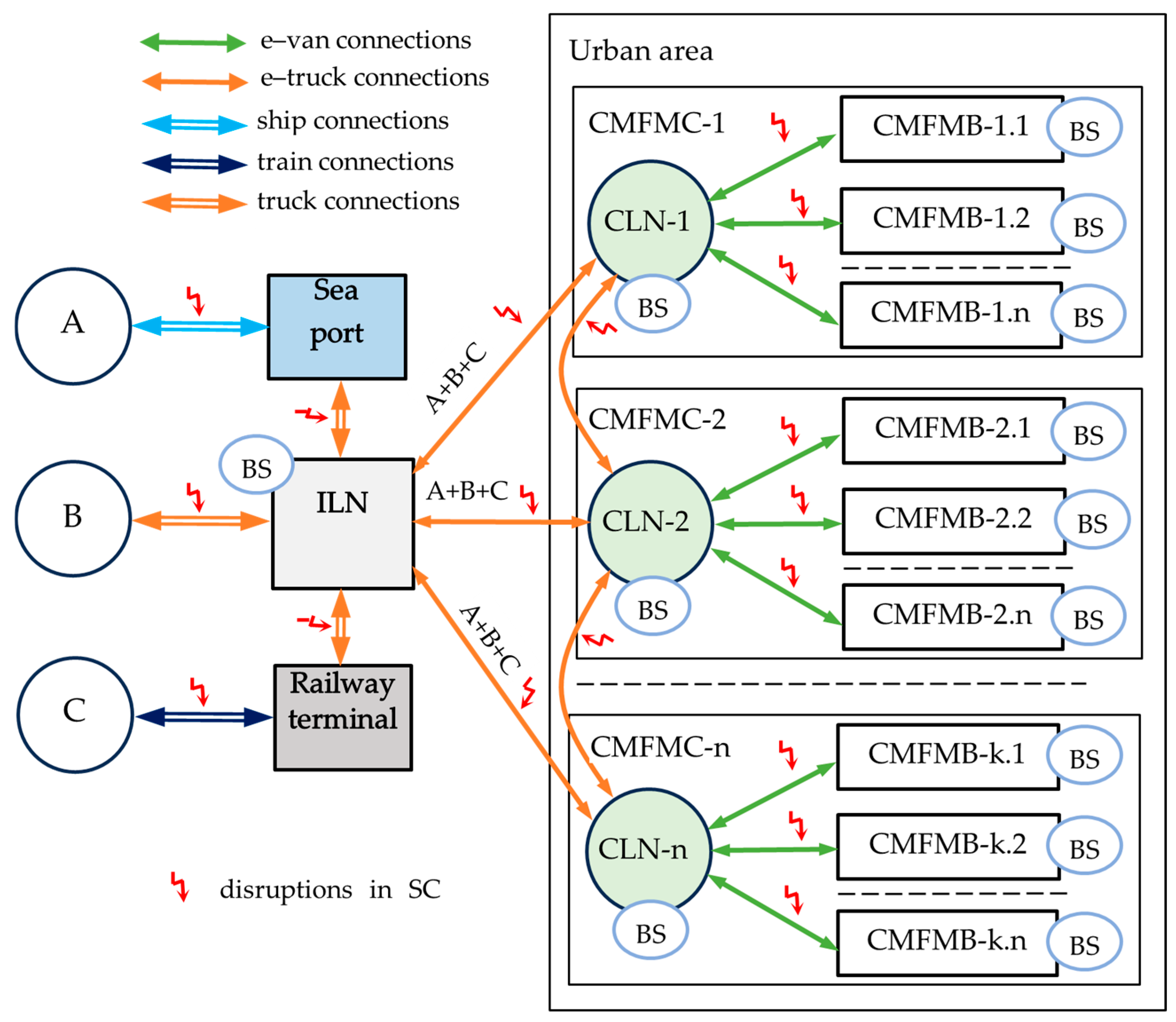 - Orders from CMFM enterprises for production materials are processed according to two rules: ‘next-day delivery’, i.e., orders are collected on a given day and delivered the next day, and ‘never less than ordered’, i.e., the volume of transported materials can be increased due to the best use of the vehicle’s cargo capacity. Shortages in supply may occur due to disruptions in intermodal transport prior to the delivery to ILN and may be affected by any of the production materials.