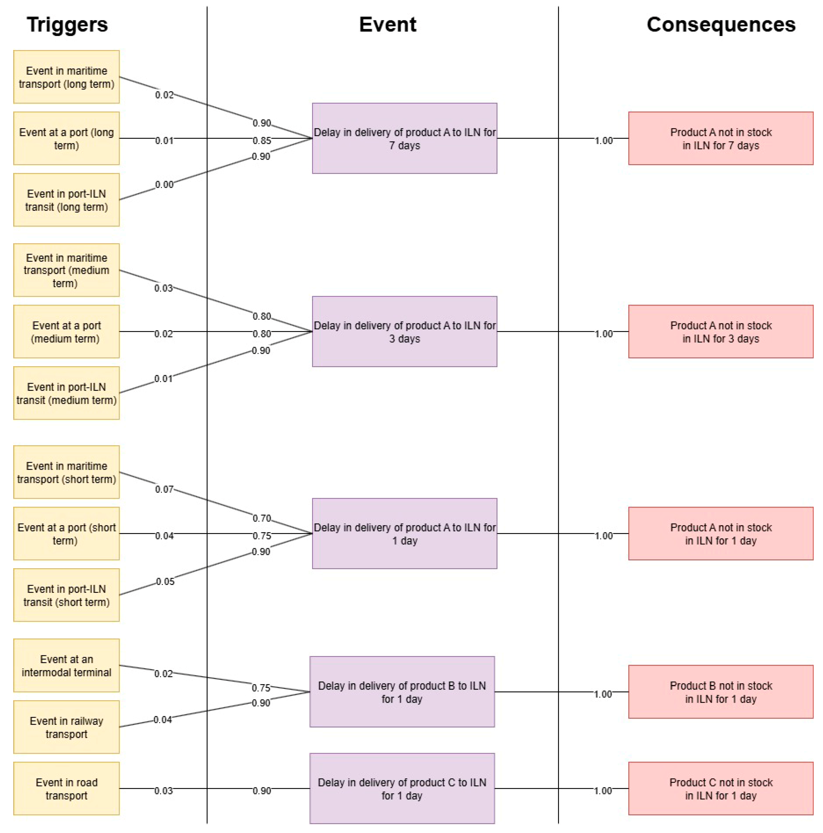 - the event Y “Delay in delivery of product A to INL for 7 days” has a probability factor of 0.90, provided the trigger X “Event in maritime transport (long term)” occurs;