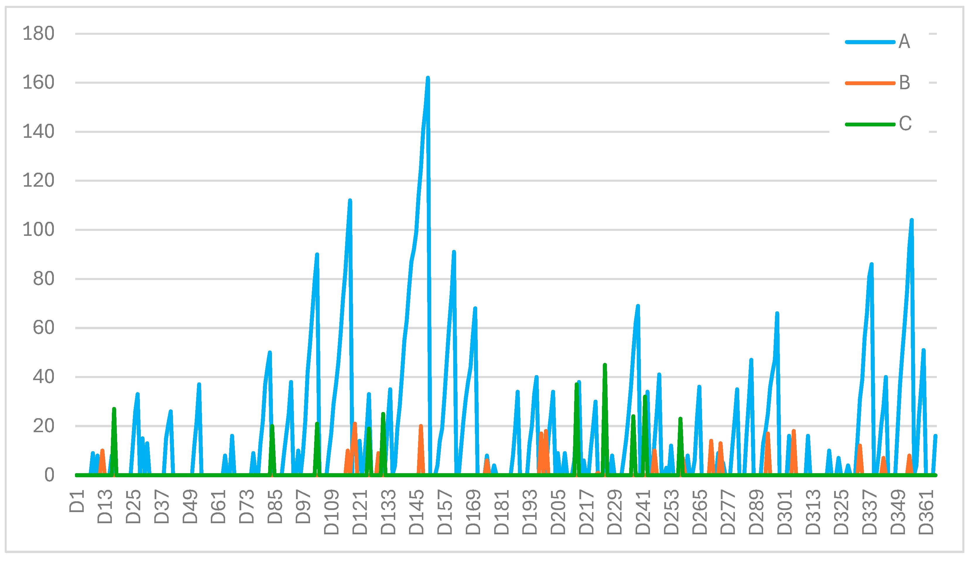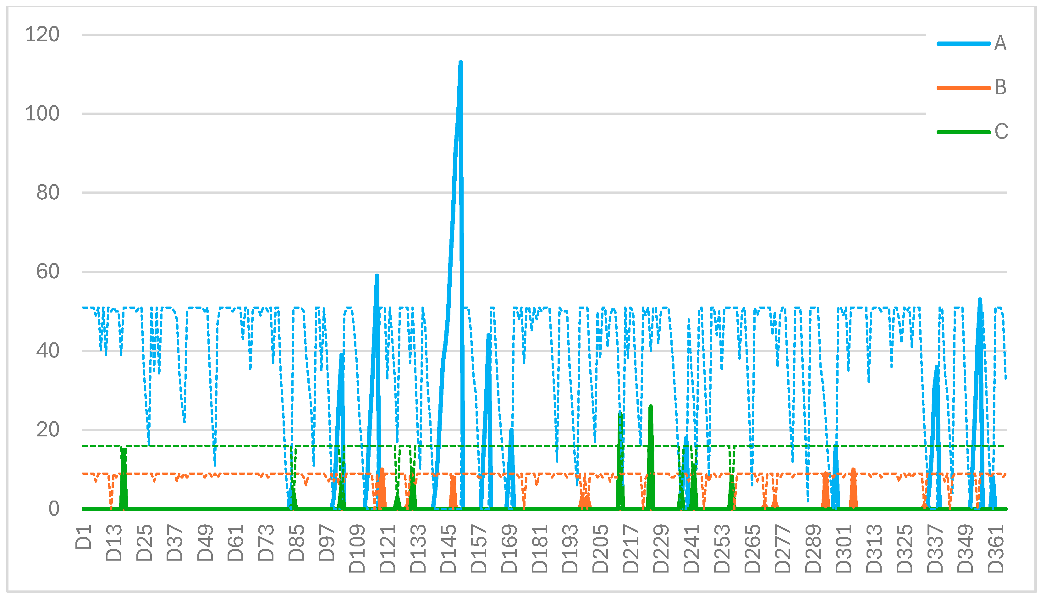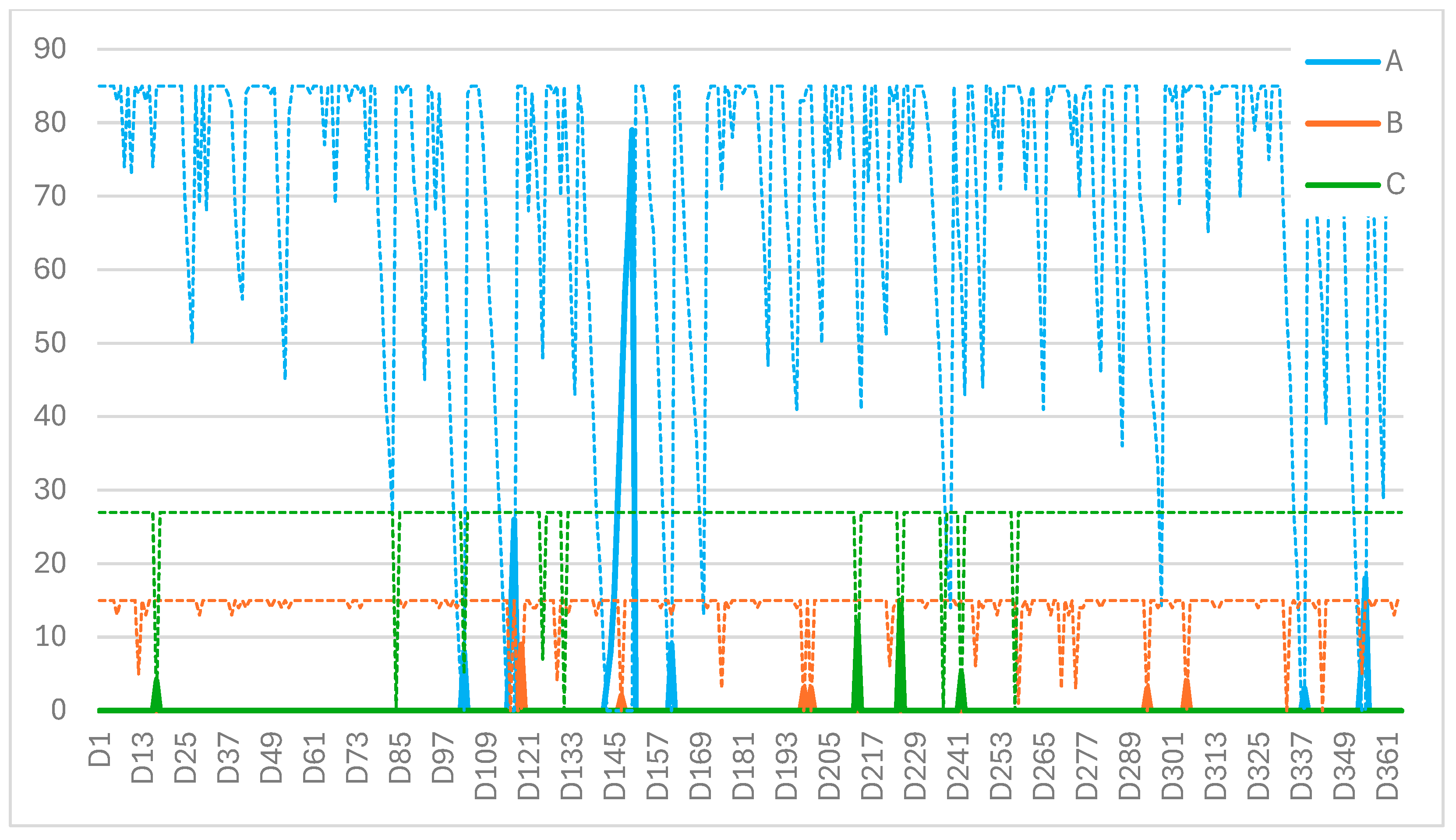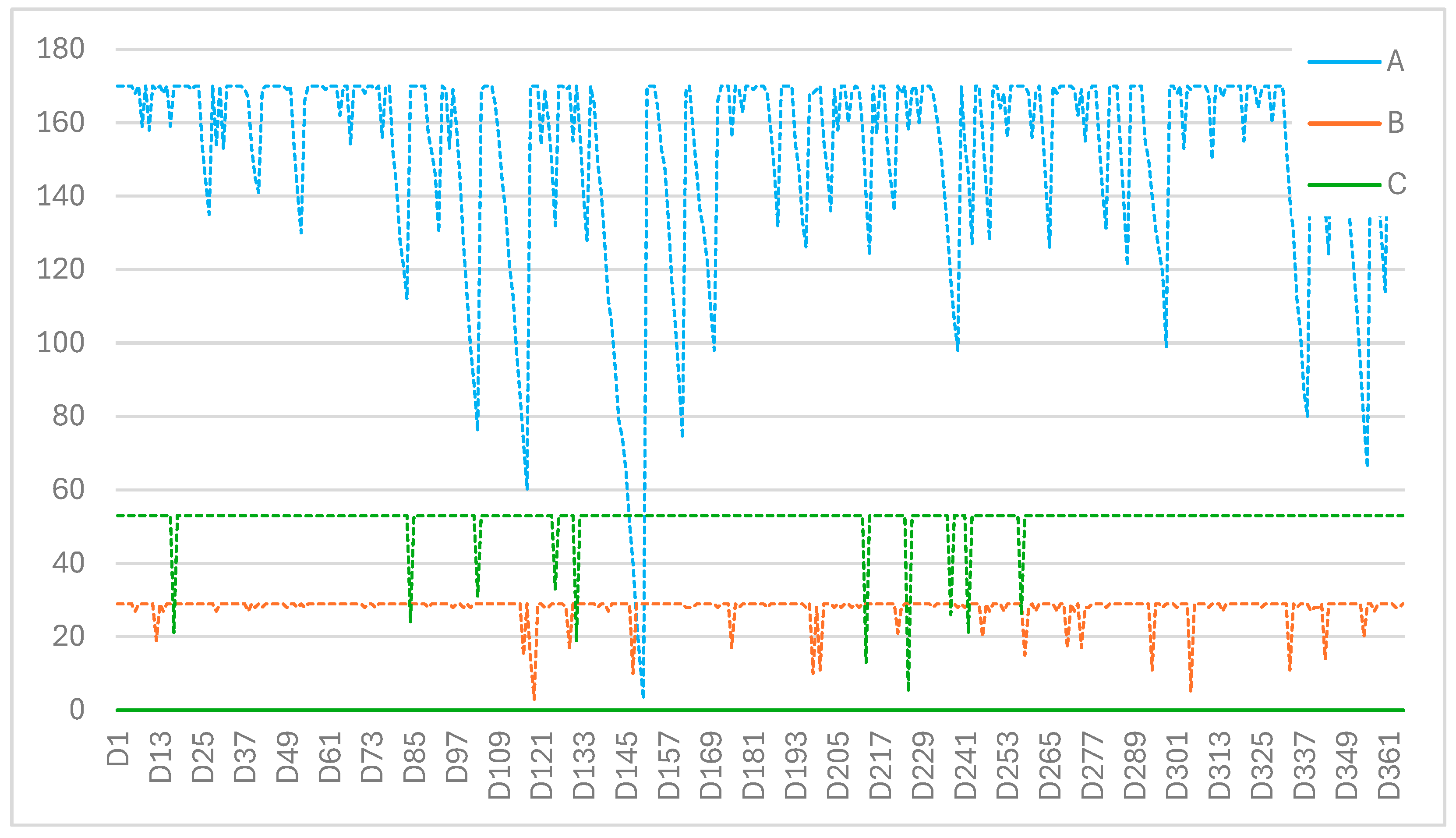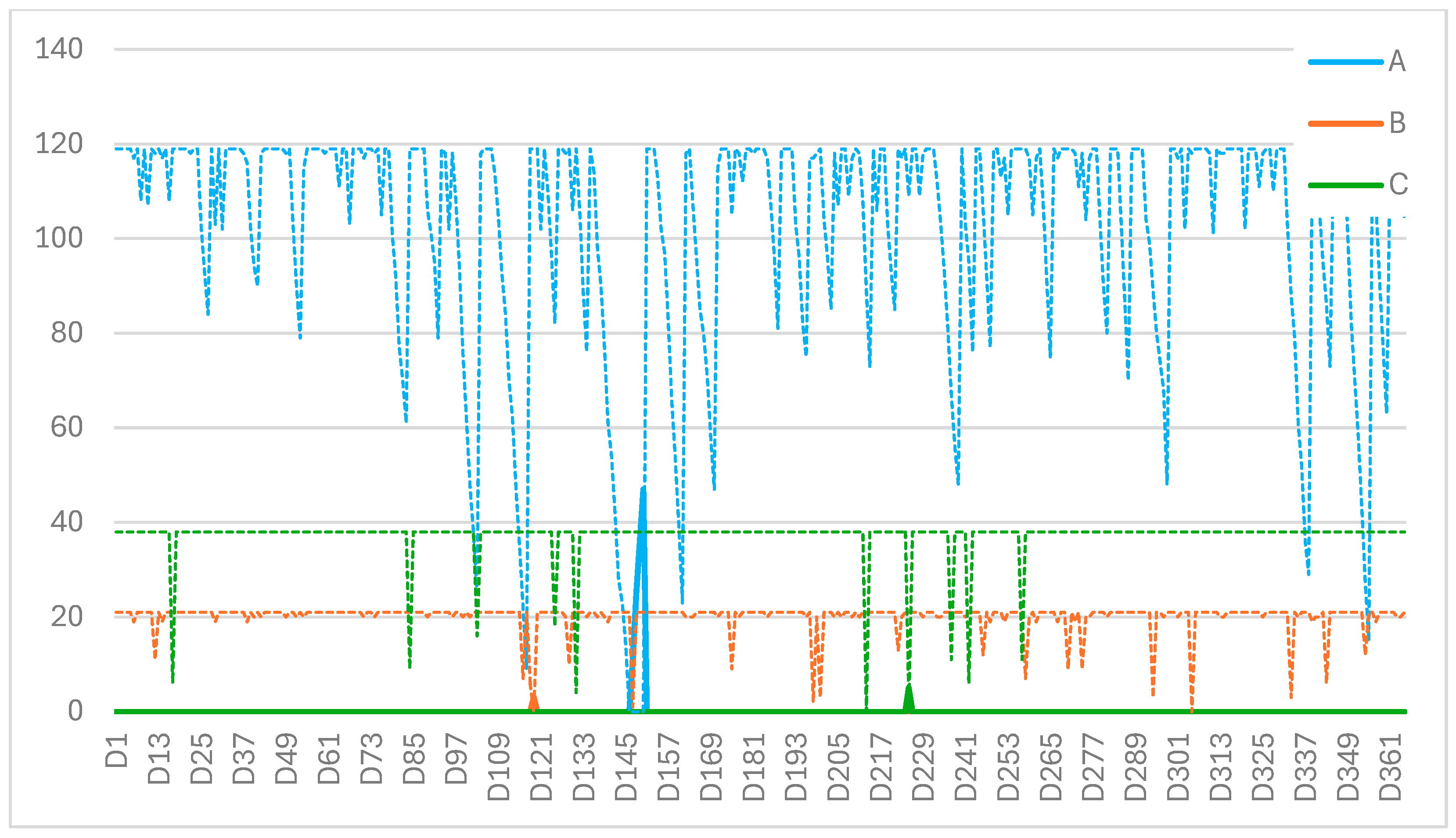 - Figure 7, Figure 8, Figure 9 and Figure 10 show characteristic variable BS values for different BSL variants. Significant decreases in the number of IRTs maintained in BS are related directly to disruptions in the supply chain, and relatively small fluctuations of 1–2 IRTs are caused by the need to preserve e-vans’ minimum capacity utilisation level. The latter quantitative changes occur when there is a shortage of the appropriate production materials stored as OS. Due to the adopted rule of surplus IRTs priorities in the e-vans loading process, the greatest BS fluctuations concern material A, followed by B, and to the least extent material C.