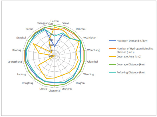 To validate the operability of the model formulas and the correctness of the calculation logic, Haikou City is used as an example [26]. Based on its population, land area, and hydrogen demand data, the regional hydrogen demand, number of hydrogen refueling stations, average coverage area, coverage radius, and average refueling distance were sequentially calculated according to the formulas presented above. This example is intended solely to demonstrate the calculation procedure and intermediate results of the model, verifying its reproducibility and applicability at the regional scale; it does not represent the final planning decision.