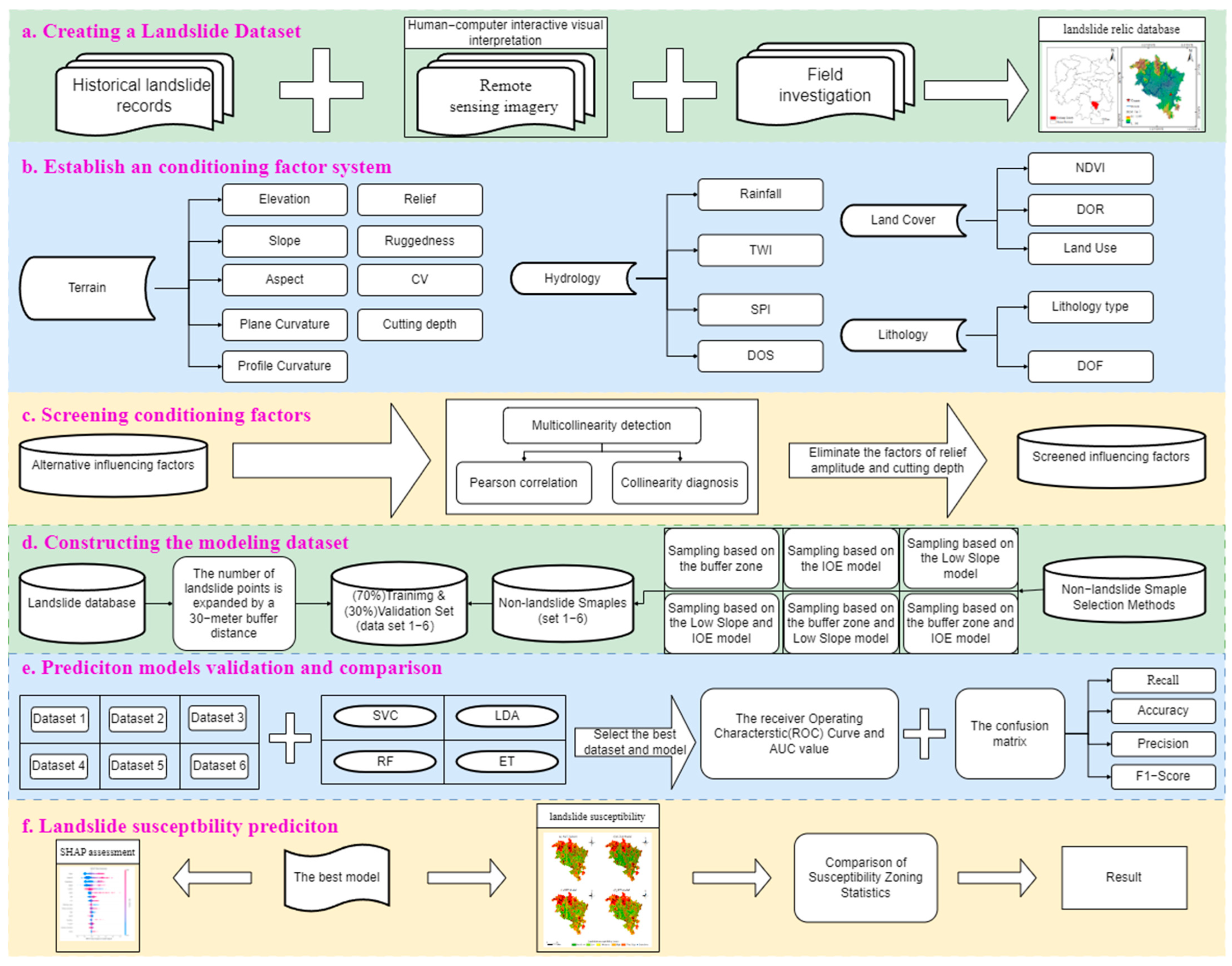 This study develops a landslide susceptibility assessment method based on sample optimization and machine learning for areas with limited landslide data. First, both landslide and non-landslide samples were optimized to identify the most effective strategy. Then, the optimal hyperparameters for four models (SVM, LDA, RF, and ET) were determined using a grid search, and their susceptibility maps were generated. Finally, the models were comprehensively evaluated using the AUC value, Accuracy, Precision, Recall, F1-score, and landslide frequency ratio [39,40].