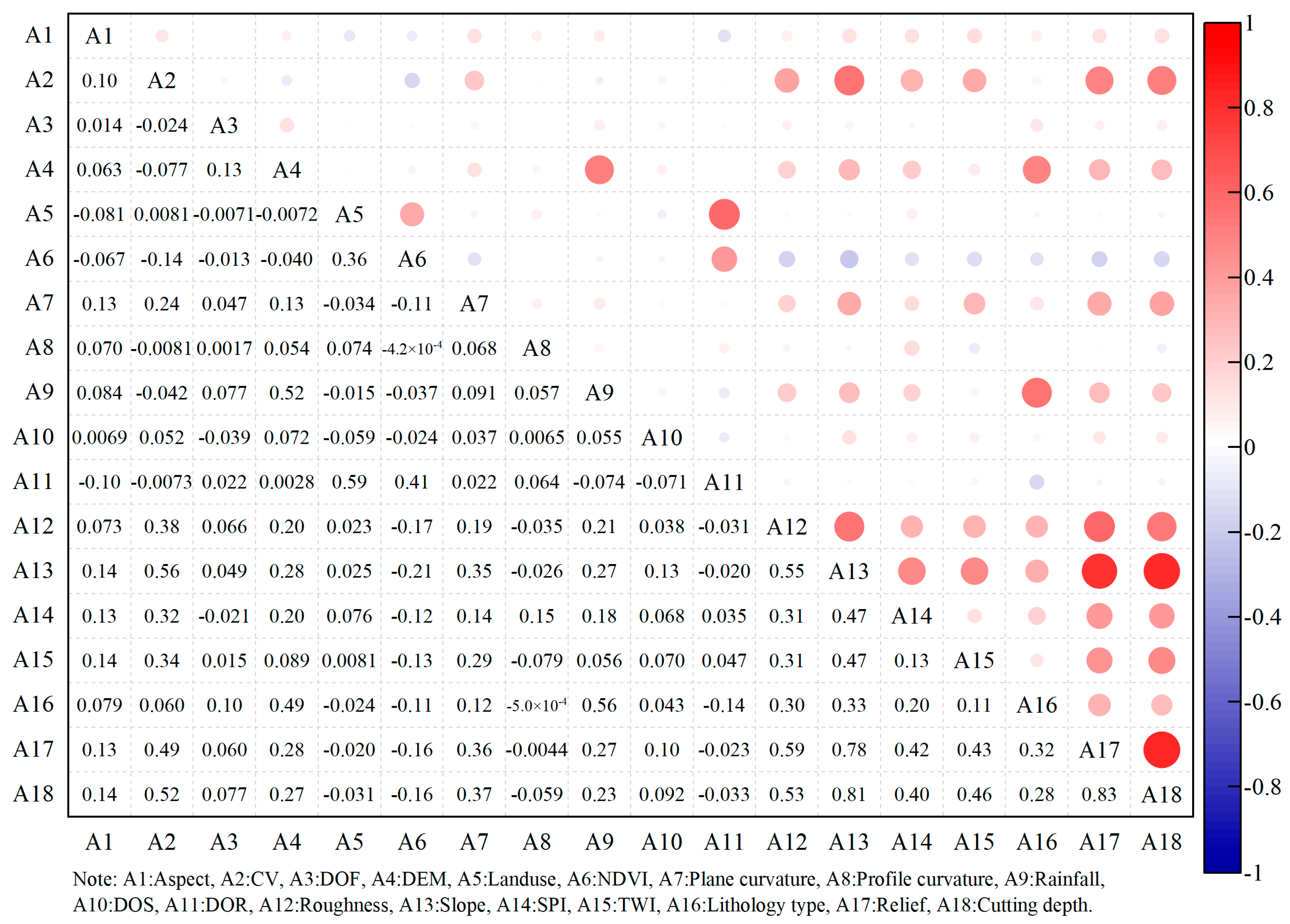 Given that landslide susceptibility assessment can be affected by collinearity among conditioning factors, which reduces model reliability, a two-step screening process was utilized. First, multicollinearity was assessed using the Variance Inflation Factor (VIF > 5 indicates issues [52]). Second, pairwise linear correlations were examined using the Pearson coefficient (|r| > 0.7 suggests a strong relationship [53]). Factors flagged by either criterion were considered for removal to minimize information redundancy.