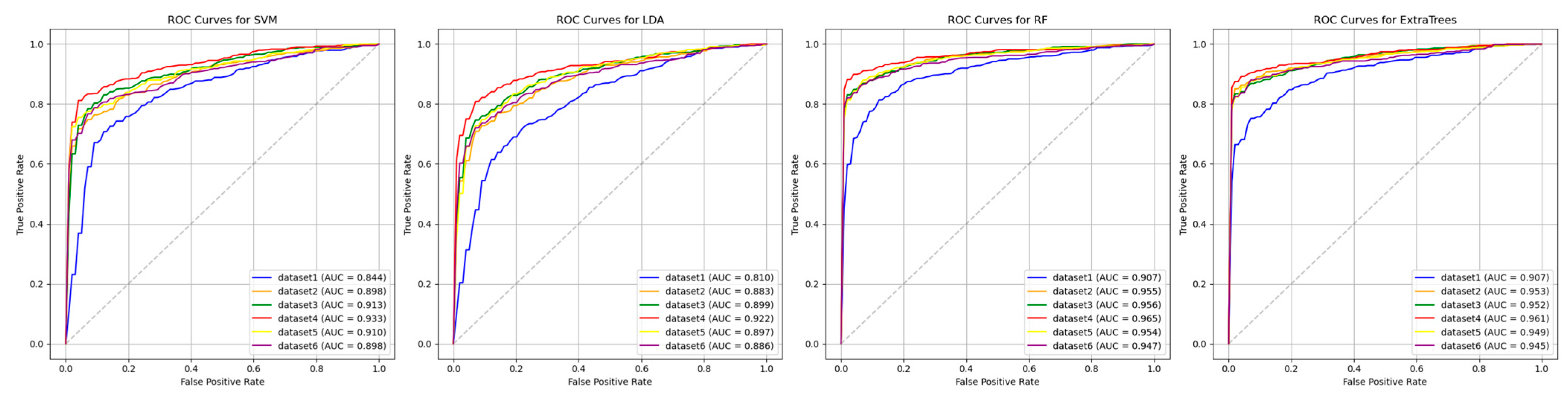 The LDA model [55] is a supervised dimensionality reduction and classification technique. It aims to find a linear projection that maximizes the separation between classes while minimizing the dispersion within each class. This is achieved by maximizing the ratio of between-class variance to within-class variance, under the assumption that all classes share a common covariance matrix and are normally distributed. LDA is particularly effective for datasets with high-dimensional features and a limited number of samples.
