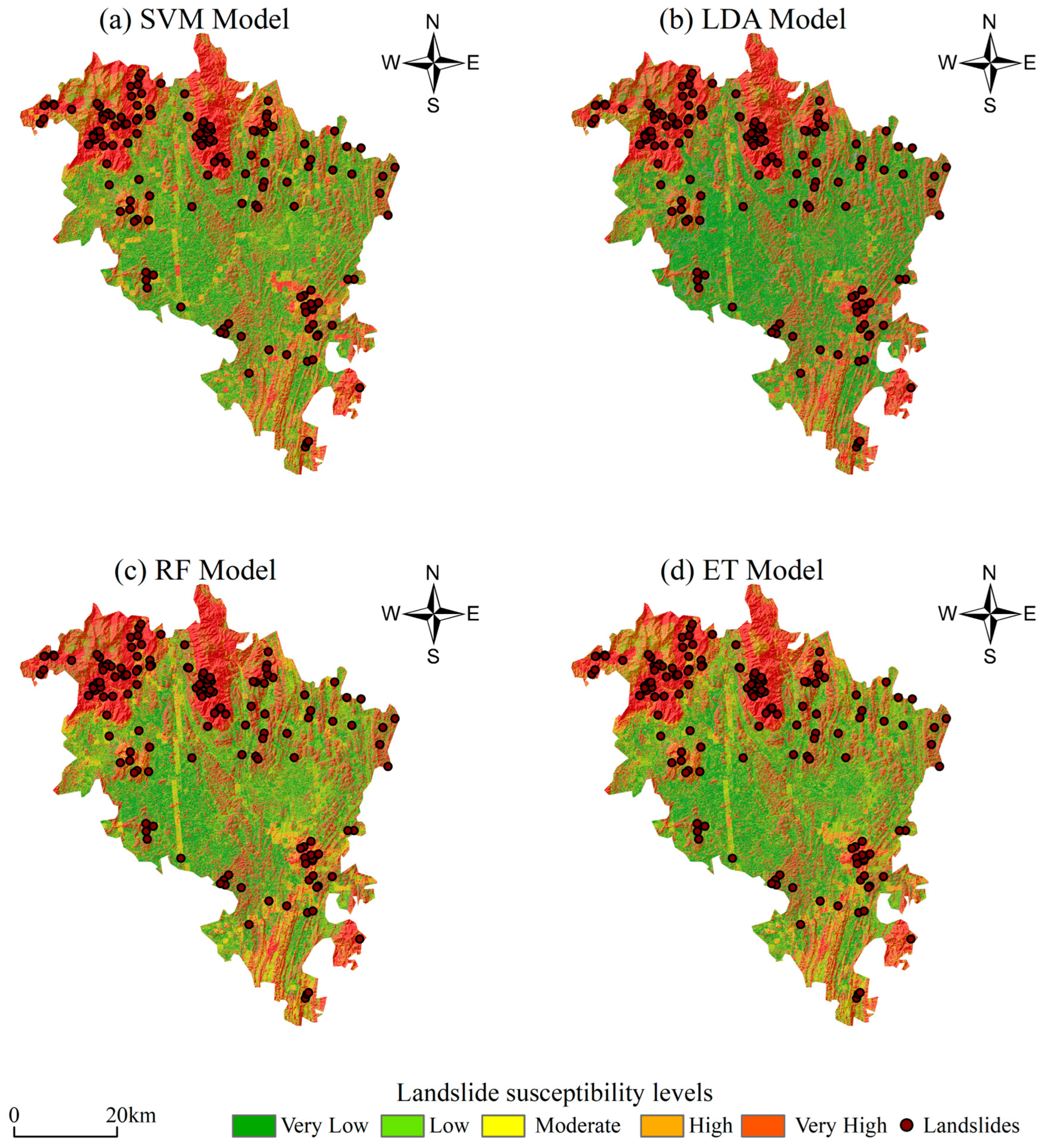 Machine learning algorithms suitable for landslide susceptibility mapping include both single models and ensemble models, with single models comprising linear regression [15], logistic regression [16,17], support vector machines (SVM) [18], and others, and ensemble models including random forests (RF) [19], gradient boosting trees [20], and others. In recent years, researchers have developed additional models by employing techniques such as boosting, bagging, stacking, voting, and blending of different models, such as XGBoost [21], LightGBM [22], Simple Stacking [23], Weighted Voting [24], Basic Blending [25], and others. However, different algorithm types vary in their- data processing methods and applicability. Currently, there is no consensus on a standardized methodology for landslide susceptibility assessment. We benchmarked two single models, SVM and linear discriminant analysis (LDA)—against two ensemble models—RF and extra trees (ET)—to systematically evaluate predictive performance.