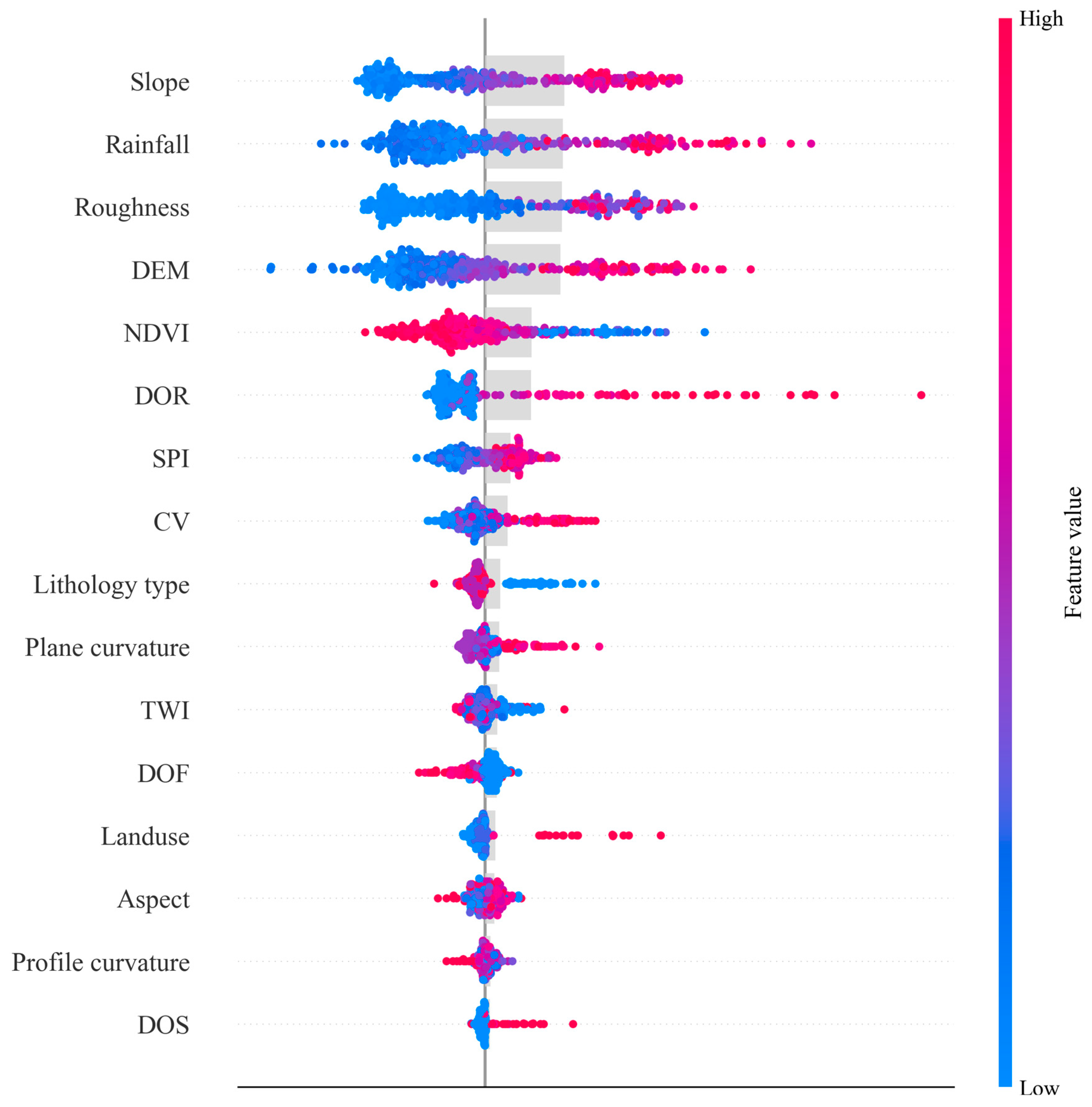 Plane Curvature: Plane Curvature refers to the terrain curvature in the direction of contour lines, which describes the bending shape of the slope in the horizontal direction. Using a 30-m DEM, plane curvature was categorized into five classes: −25.78 to −2.96, −2.96 to −0.98, −0.98 to 0.33, 0.33 to 2.09, and 2.09 to 30.18, where the range from −0.98 to 2.09 accounts for 83%.