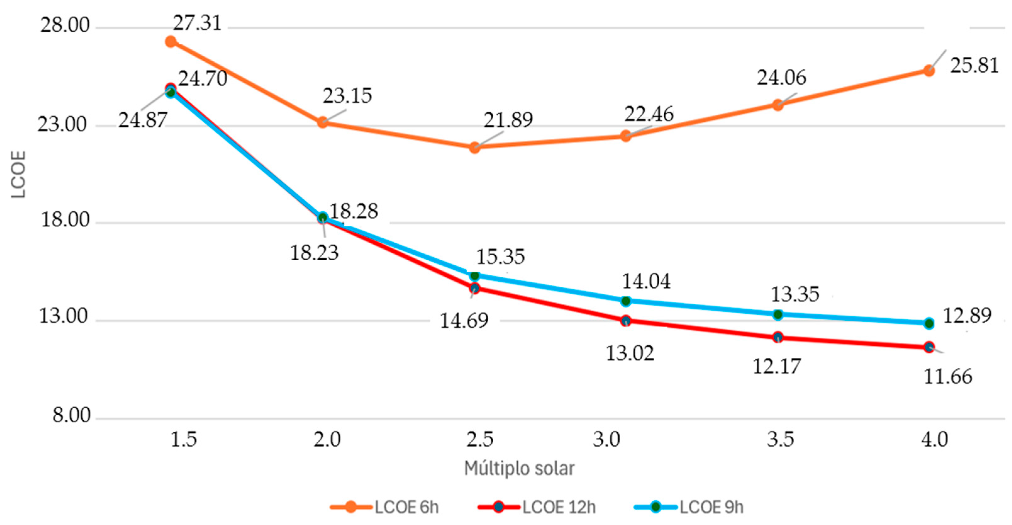 14] in Mexico. It presents an operational and economic study that compares the hybrid system to that used in the microgrid. The results show that the levelized cost of energy (LCOE) for the PV/CSP hybrid system is USD 0.524/kWh, only 2% higher than the LCOE of the photovoltaic battery, which is USD 0.51/kWh. However, in a scenario where the PV/CSP system is deployed in a community with a 50% increase in energy demand, the levelized cost of energy (LCOE) rises to USD 0.506/kWh. Conversely, if the community’s energy demand surpasses 500 kW, the LCOE of the PV-CSP system decreases by 26%, highlighting the economic advantage of scaling up the system.