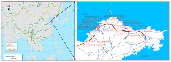 With a cumulative water transfer volume exceeding 76.7 BM3, the SNWD project has directly benefited 185 million residents and been pivotal in addressing spatial disparities in water resources distribution [55]. SWDA, as part of the eastern route of SNWD, was started in 2003, with water from the Yellow River and the Yangtze River diverted eastward with a canal 271 km long, passing through 255 rural villages [56] (See Figure 1 [57]).