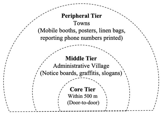 A “three-tier” mobilization network is made to inform the villagers systematically. For villagers living within 500 m of the project venue, or the core tier, who might not read or write, the staff adopt the “door-to-door” method to explain the monitoring rationale in detail. The middle tier covers the entire administrative villages, for which “notice boards” are used on the exterior walls of the village committees, public halls, and shops. Graffiti, sketches, and brand slogans are used to enable better understanding. The peripheral tier extends to densely populated areas in towns. Mobile booths are set up with customized posters and linen bags, and reporting phone numbers are printed to increase mass participation (See Figure 3).