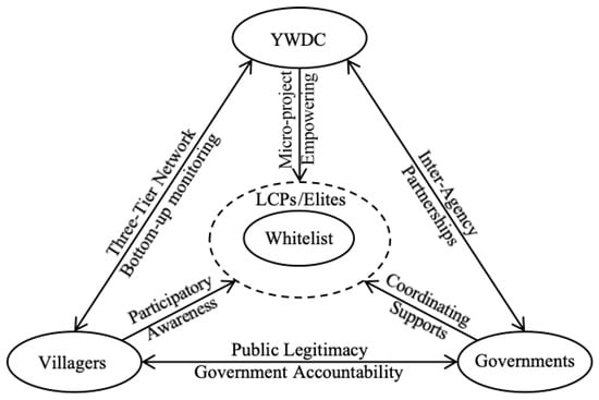 Figure 4 shows the whitelist at the core of a tripartite pyramid, with the co-monitoring interface composed of governments, SWDA, and villagers. Together, they exert influence on the elites through micro-project empowerment, participatory awareness, and coordinating support. The triangular partners consolidate their positions through mutual communications.