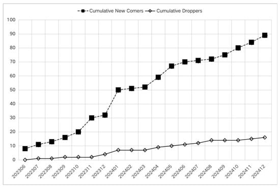 For the LCPs, although the competition pushes them out of their former comfort zones, with some even being eliminated from the game, the most capable can survive both the tripartite co-monitoring and their peers. An interesting phenomenon was that since the release of the “Notice Regulating ‘micro-projects’”, the number of newly registered LCPs increased from 8 at the very beginning to 89 by the end of 2024, while the cumulative droppers were less than 20 [82]. The LCP team is growing instead of shrinking (See Figure 5).