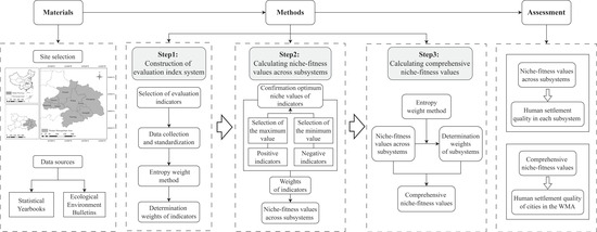 This research develops a niche fitness theory-based framework to assess urban human settlement quality (Figure 1). The process begins with data preparation, involving site selection and data collection from official publications. The methodological core consists of three sequential steps: first, establishing an evaluation index system and determining indicator weights using the entropy weight method; second, calculating subsystem niche-fitness values by integrating optimal niche values with predetermined weights; and third, deriving comprehensive city-level scores through a weighted aggregation of subsystem values, with the weights determined by a second application of the entropy weight method. Ultimately, this approach enables a multidimensional assessment: the subsystem values reflect quality in specific settlement aspects, while the comprehensive scores quantify the overall urban settlement quality for each city.