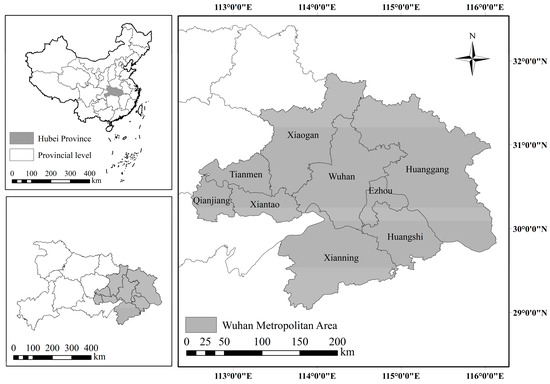 The Wuhan Metropolitan Area (WMA), as a reginal urban cluster, comprises Wuhan and eight neighboring cities within its 100 km radius: Huangshi, Ezhou, Xiaogan, Huanggang, Xianning, Xiantao, Tianmen and Qianjiang (Figure 2). As Hubei Province’s primary hub for industry and resources, the WMA occupies 33% of the province’s territory yet hosts 51.6% of its population and generates 60.45% of its GDP, achieving 3.37 trillion yuan in 2023. Characterized by high urban density, a robust economic base, and favorable environmental conditions, the WMA is focused on building integrated one-hour commuting and daily living circles to strengthen connectivity in transportation, economy, and social development. The WMA’s strategic importance has been consistently reinforced through national planning. In 2014, it was designated as a “national demonstration zone for building a resource-efficient and environmentally friendly society” and a “national pilot zone for independent innovation.” By 2022, its development plan was officially approved by the National Development and Reform Commission, marking it the seventh national-level metropolitan area in China. During this period, the region experienced sustained economic growth, with GDP exceeding RMB 3.2 trillion in 2022—an increase of RMB 1.5 trillion since 2014—accounting for over 59% of Hubei Province’s total economic output. Leveraging its central location and advanced transportation network, the WMA enhances synergy across the region and reinforces its role as the core driver of Hubei’s economy and a strategic anchor for central China’s development.