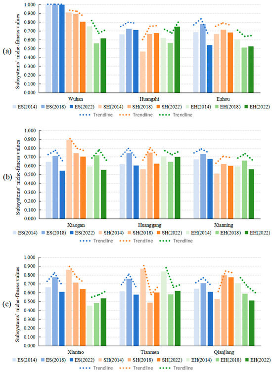 Temporal variation of niche-fitness values across WMA subsystems (2014–2022): (a) Wuhan, Huangshi and Ezhou; (b) Xiaogan, Huanggang and Xianning; (c) Xiantao, Tianmen and Qianjiang.