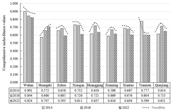 Comprehensive human settlement quality metrics for each city were calculated using Equation (8) to aggregate weighted niche-fitness values across subsystems (Figure 3). The analysis revealed distinct spatial stratification and temporal evolution among the nine cities during 2014–2022. Specifically, in 2014, clear stratification emerged among the nine cities. Wuhan led with a niche-fitness value of 0.901, exceeding the lowest-performing city of Huangshi by 1.5 times. Five cities including Ezhou, Huanggang, Qianjiang, Xianning, and Huangshi fell below the regional average of 0.683, revealing significant development disparities. By 2018, Wuhan maintained leadership with a human settlement quality score of 0.844, exceeding last-ranked Tianmen by 1.4 times. Five cities including Ezhou, Xiantao, Xianning, Huangshi, and Tianmen fell below the regional average of 0.700, demonstrating persistent quality disparities. The 2022 assessment showed Wuhan maintaining its leading position with a score of 0.824, with Huangshi rising to second position. Six cities including Huanggang, Xianning, Xiaogan, Xiantao, Tianmen, and Ezhou fell below the regional average of 0.649, maintaining a 1.4-times gap between highest and lowest performers. Longitudinal analysis reveals two key trends: the regional average declined by 0.034, indicating overall quality deterioration, while the disparity ratio between highest- and lowest-performing cities narrowed from 1.5 to 1.4, suggesting gradual convergence despite the general downward trend. These patterns highlight both persistent challenges and evolving dynamics in the WMA’s human settlement development.