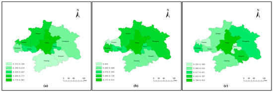 This study employs Geographic Information System (GIS) spatial analysis to visualize and assess the spatiotemporal patterns of human settlement quality across the WMA based on comprehensive niche-fitness values. The spatial visualization enables effective identification of distinct spatial differentiation characteristic through detailed classifications, revealing inter-city settlement disparities and tracking evolutionary trajectories across different development phases. Figure 5 presents the results of the spatiotemporal analysis, demonstrating distinct patterns from 2014 to 2022. Specifically, Figure 5a illustrates the 2014 spatial distribution, presenting a clear west–east gradient with higher values in western areas and a pronounced north–south differential, establishing a distinct core-periphery structure centered on Wuhan. Figure 5b displays the 2018 distribution, indicating improved overall conditions with a persistent north–south gradient, though regional disparities showed some reduction. Figure 5c reveals the 2022 distribution, demonstrating a concerning regional decline and regression in settlement conditions across the metropolitan area. Comprehensively, a clear core-periphery diffusion pattern of overall human settlement quality emerged, characterized by Wuhan’s consistent superior performance as the regional center while quality progressively diminishes in outward radiating gradients. Although the hierarchical core-periphery structure persisted throughout the entire study period, the inter-city disparities measured by the range between maximum and minimum values exhibited a gradual narrowing trend over time, indicating a converge of spatial differences. These patterns demonstrate both reduced inequality across the metropolitan area and concerning settlement deterioration in multiple cities, highlighting the need for differentiated regional development strategies. The GIS-based spatial analysis not only provides intuitive comparative visualization but also offers robust data support for regional coordination planning. This methodology effectively identifies spatial imbalances and optimization opportunities throughout the urban agglomeration, contributing to evidence-based policy formulation for sustainable regional development.