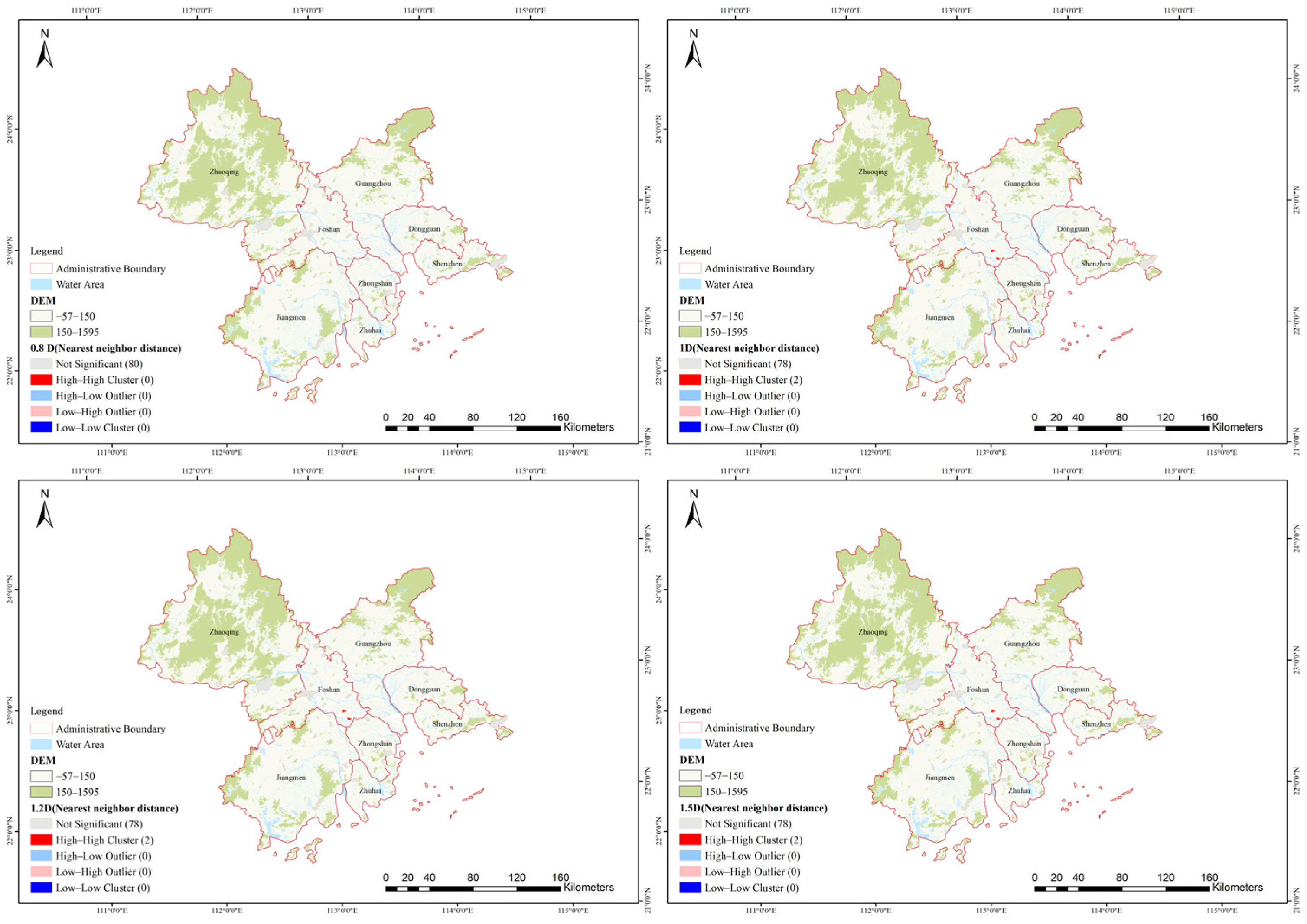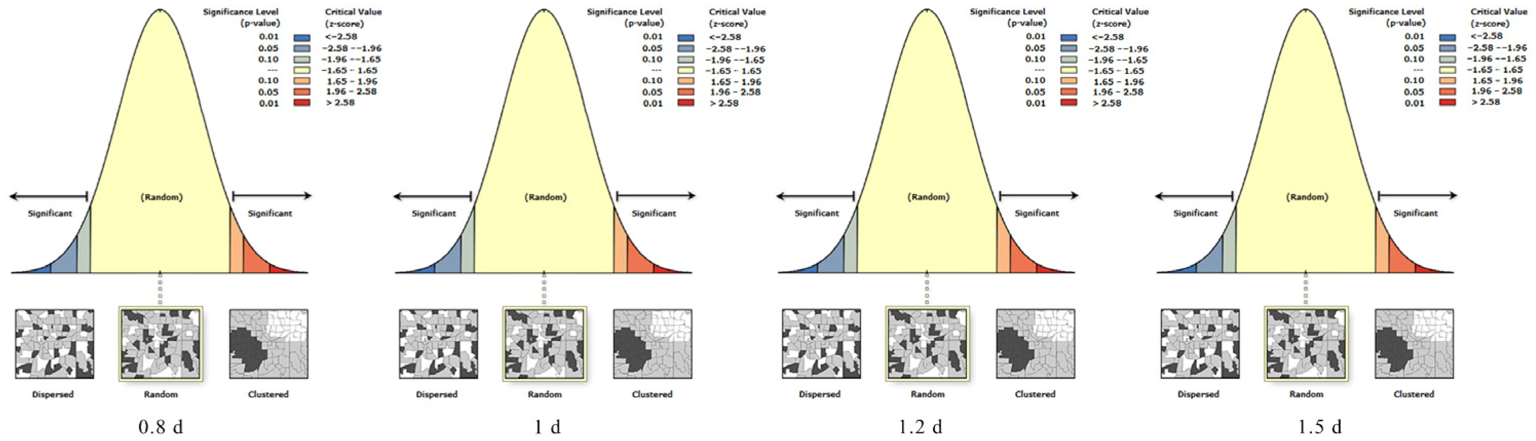 | Critical Distance Parameter | Moran’s I Index | z-Score | p-Value | Significance (p < 0.05) | Spatial Pattern |