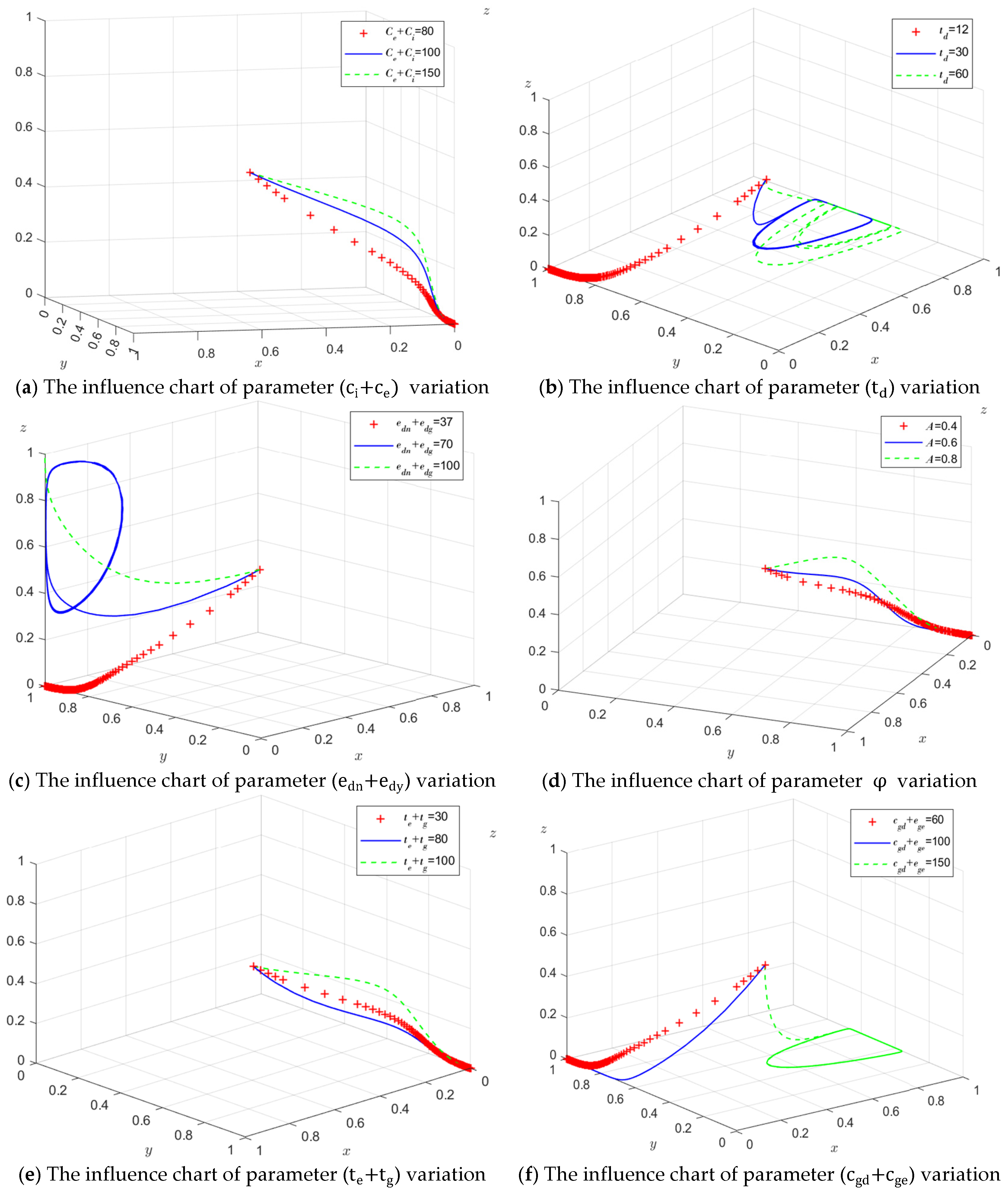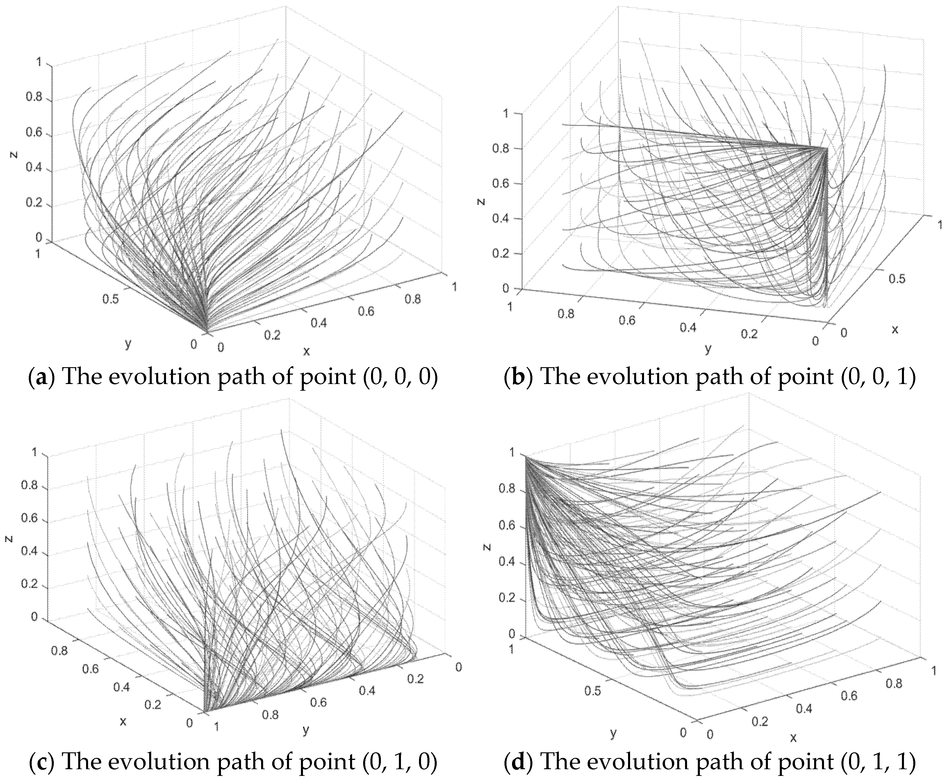 Table 3, it can be seen that (1, 0, 0), (1, 1, 0), (1, 0, 1), (1, 0, 1) and (1, 1, 1) have positive eigenvalues, so it cannot be an evolutionary stability strategy, and four evolutionary stability points and their conditions are obtained, namely (0, 0, 0), (0, 0, 1), (0, 1, 0), (0, 1, 0), and (0, 1, 1). The stability of these four equilibrium points can be discussed in the following four situations: