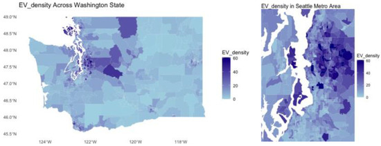 To account for demographic and built-environment factors that influence EV adoption, we include a set of tract-level controls commonly used in prior cross-sectional studies [8,30,31,32]. These covariates include median household income, the share of adults with a bachelor’s degree or higher, population density, renter share (as a proxy for access to off-street or home charging), median age, and racial makeup.