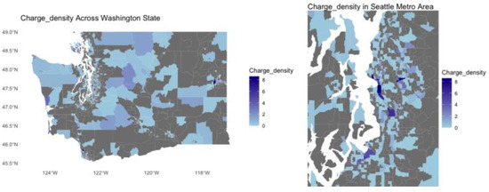 Figure 1 illustrates the geographic distribution of EV adoption across Washington State and in the Seatac region, with darker tracts indicating higher registrations per 1000 residents. Figure 2 shows the density of publicly available charging stations, highlighting that while some areas have dense infrastructure, others—particularly rural tracts—have few or no chargers. Finally, Figure 3 presents average commute times, which vary across tracts and provide a proxy for range-related concerns. Together, these maps underscore the spatial heterogeneity in adoption, infrastructure, and commuting behavior that motivates the tract-level analysis.