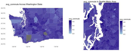 Average commute time across Washington State (left) and Seatac area (right). Darker shading indicates longer average commute times (hours). Data sourced from the 2020 ACS5.
