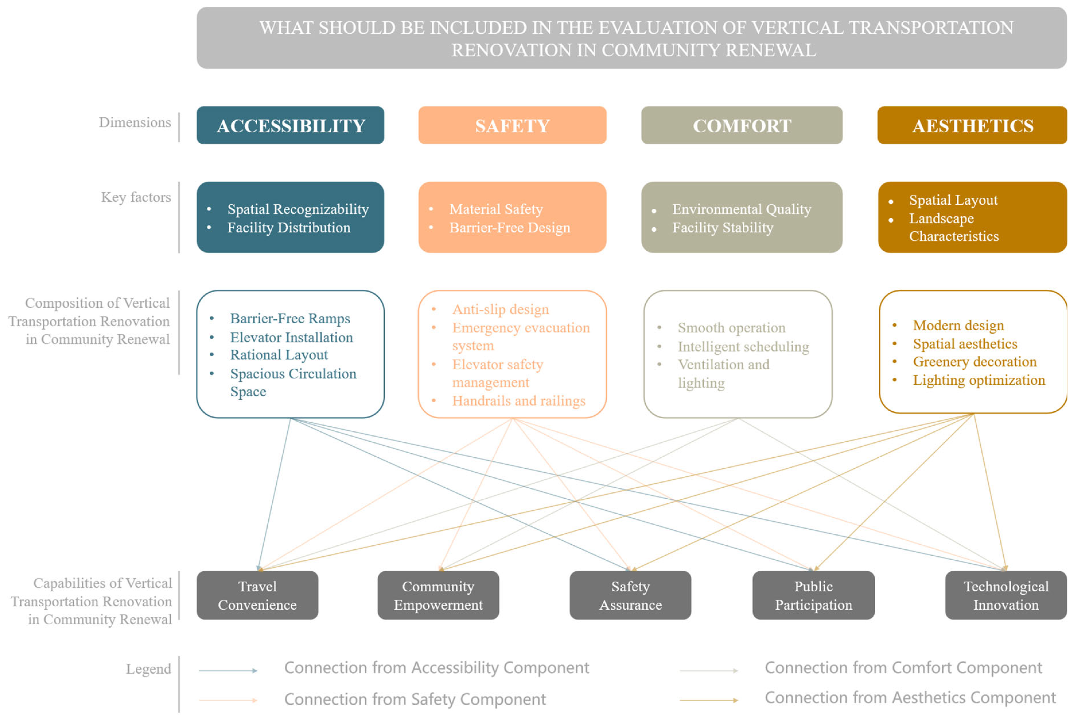 Figure 3. Conceptual Framework Outlining the Dimensions, Factors, and Functional Components of Vertical Transportation Renovation within Community Renewal Efforts.