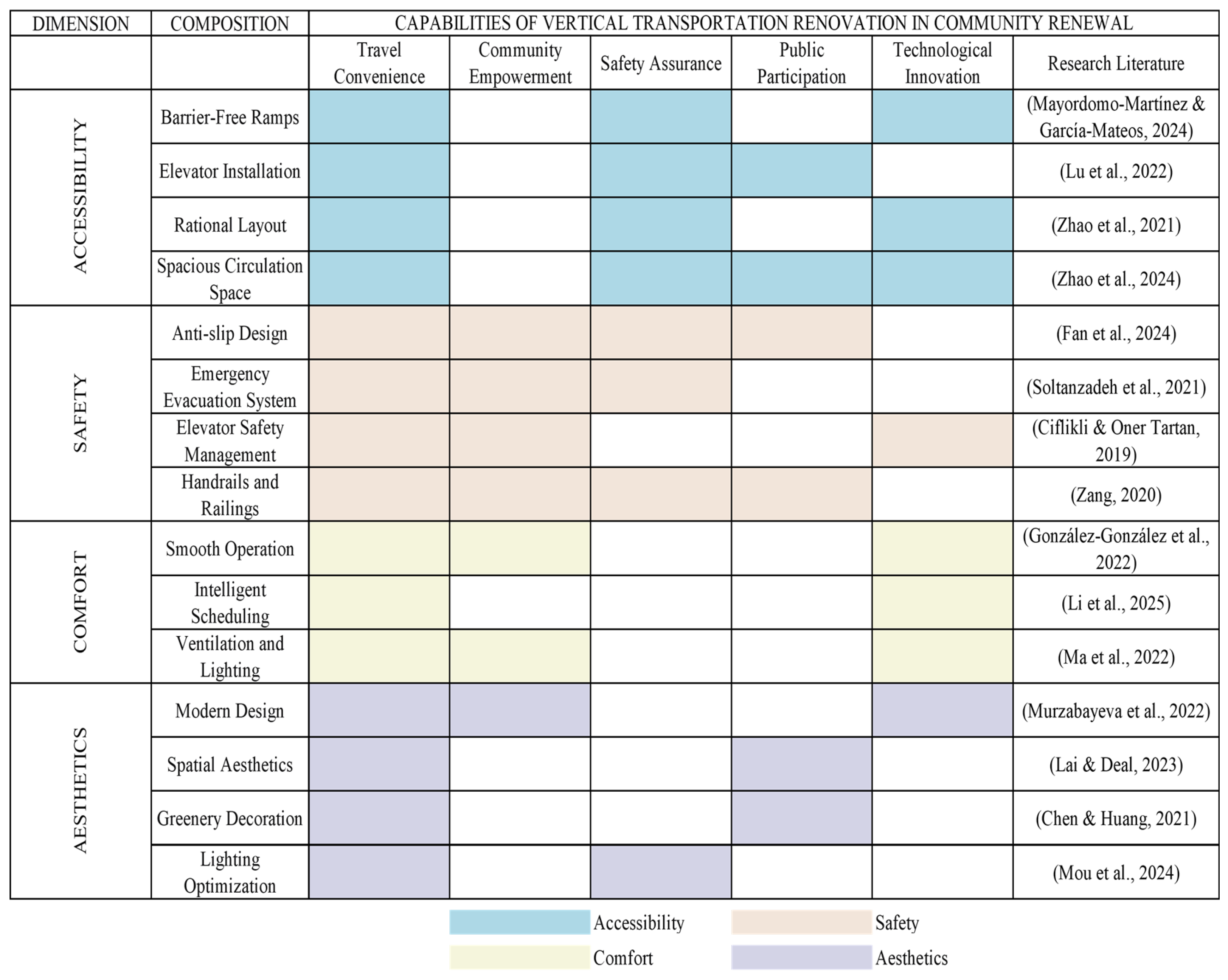 In community revitalization, vertical transportation renovation modernizes building and urban mobility systems through methods such as adding elevators, optimizing stair design, and improving accessible pathways, aimed at mitigating the negative effects of outdated facilities on residents’ mobility, particularly addressing the challenges faced by older adults and individuals with disabilities [54]. These renovations can directly address the mobility barriers caused by aging buildings and facilities. However, an extensive review of the literature reveals a persistent lack of a comprehensive evaluation framework for vertical transportation renovations, particularly one that assesses whether these interventions effectively alleviate issues such as mobility challenges, social isolation, and unsuitable living environments. According to the literature, optimization strategies for public spaces in aging communities include accessibility, safety, comfort, and aesthetics [20,21]. Key factors include accessible ramps [59], anti-slip designs [52], smart scheduling, and green decoration [61], among others (Figure 3). The analytical table provides an evaluative summary of vertical transportation upgrades as part of community renewal strategies, drawing on the literature reviewed (Figure 4).