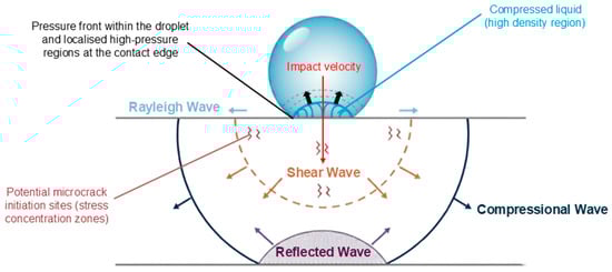 Raindrop erosion on the leading edges of wind turbine blades is a complex, high-energy phenomenon caused by the continuous impact of high-velocity water droplets. This repeated interaction leads to gradual material degradation and surface deterioration driven by a combination of dynamic physical forces and the material’s mechanical response. When a high-velocity raindrop strikes the blade’s surface, it generates a momentary but exceedingly intense pressure pulse, known as water hammer pressure. This sudden pressure can reach magnitudes significantly higher than atmospheric pressure, potentially exceeding the dynamic fracture strength of the protective coating or the underlying composite substrate [17,18]. At the moment of impact, two primary wave fronts are generated: a longitudinal compressional normal stress wave that travels directly through the material, and a transverse shear wave that propagates away from the impact location as illustrated in Figure 1. The shear wave is generated as the contact area between the droplet, and the material increases during impact [12]. Additionally, due to droplet deformation, a Rayleigh wave forms, which remains confined to the target surface.