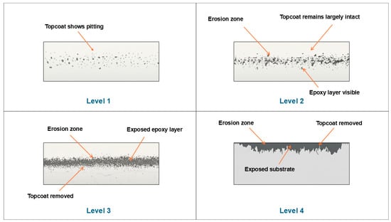 This subsurface accumulation of damage gives rise to the commonly observed “incubation period” in erosion testing, during which internal fatigue damage progresses while the surface remains macroscopically intact [31]. Several failure modes are associated with this process. These include uniform erosion, where material is gradually removed across the surface; adhesive failure at the interface between the Leading-Edge Protection (LEP) coating and the substrate; and localised failure stemming from manufacturing defects or microstructural discontinuities [31]. The visual progression of damage is often staged, beginning with minor pitting or roughness on the topcoat (Level 1), progressing to intermittent exposure of the underlying epoxy (Level 2), and eventually leading to full removal of the topcoat and complete substrate exposure (Levels 3 and 4) [32], as illustrated in Figure 2.