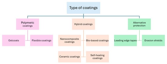 Protective solutions for wind turbine blades are classified based on composition and application method into polymeric, hybrid and alternative systems, as illustrated in Figure 5.