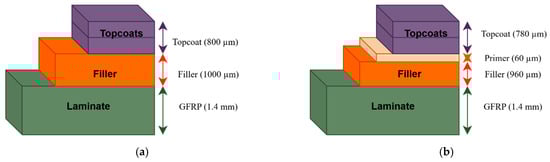 Post-mould coatings are applied after blade fabrication, most commonly by spraying or painting flexible polyurethane-based layers. These coatings are widely used for LEP and allow more versatility in material choice compared to in-mould systems. Cortes et al. [21] reported that elastomeric post-mould coatings outperformed rigid in-mould gelcoats in rain erosion testing. The performance of LEP systems can be further improved with multilayer architectures incorporating putty and primer layers; the addition of a primer significantly improved adhesion and reduced delamination risks. A schematic representation of the coating layer is shown in Figure 6. Similarly, Keegan et al. [13] noted that post-mould coatings provide flexibility and repairability, making them well suited for both initial protection and maintenance. Nonetheless, Herring et al. [12] pointed out challenges associated with manual application, such as surface defects, poor adhesion due to contamination, and difficulties in field repairs under uncontrolled conditions.