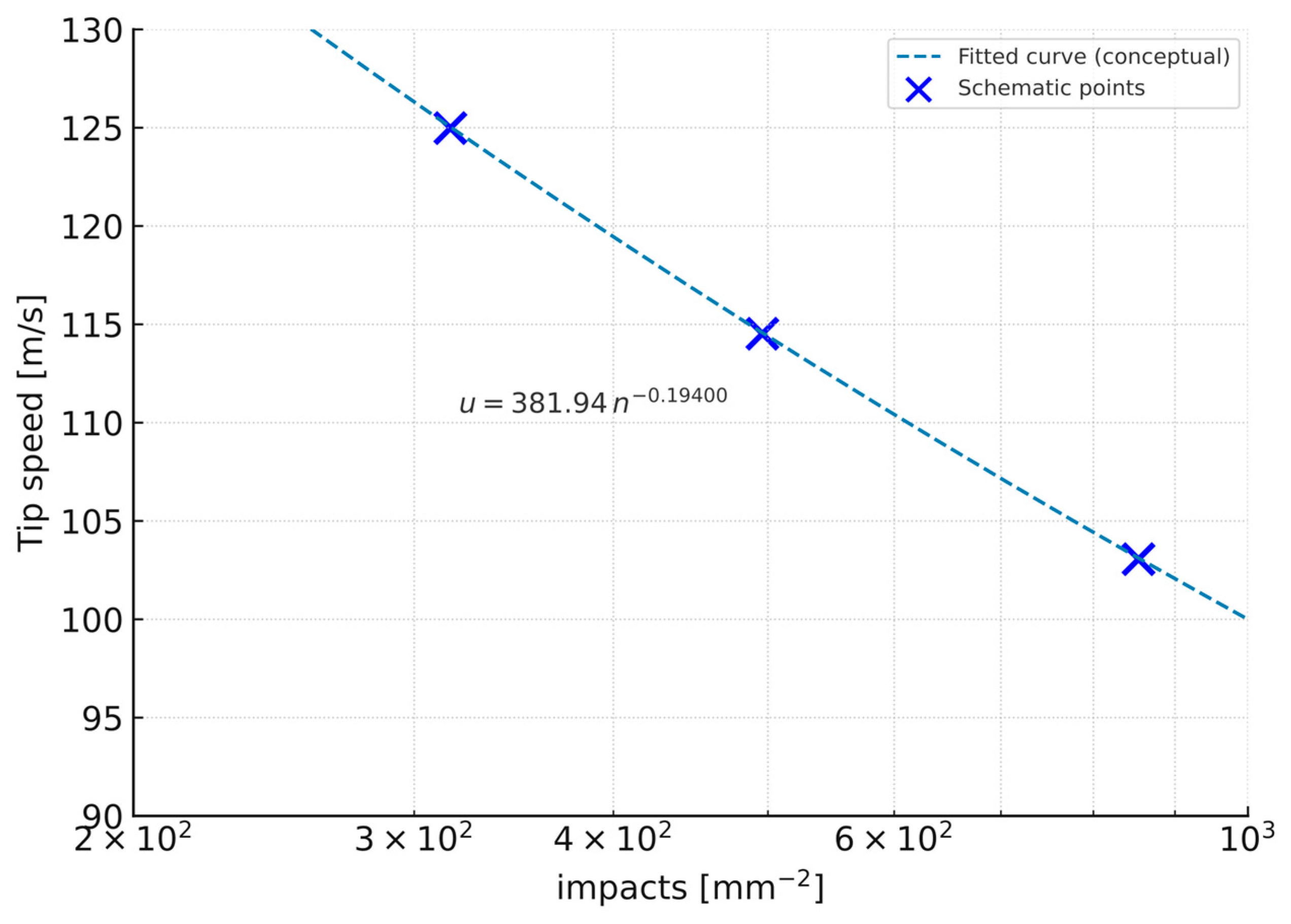 One widely adopted framework for predicting erosion lifetime is the velocity–number of impacts (V–n) curve, which characterises the relationship between impact speed (V) and the number of impacts (n) required to initiate coating failure. Typically derived from rain erosion testing (RET), the V–n relationship is commonly expressed as a power law and serves as a fundamental metric for estimating the characteristic life of erosion-resistant coatings under controlled conditions. A conceptual illustration of the V–n relationship is shown in Figure 3, demonstrating the inverse relationship between impact speed and the number of impacts to failure of the framework, such as the V formulation proposed by Tempelis and Mishnaevsky [37], which normalises the number of impacts per unit area, enabling its integration into probabilistic lifetime models. In this context, the ratio is treated as a damage fraction analogous to Miner’s rule for fatigue, and its cumulative summation yields a global damage variable that governs predicted failure onset.