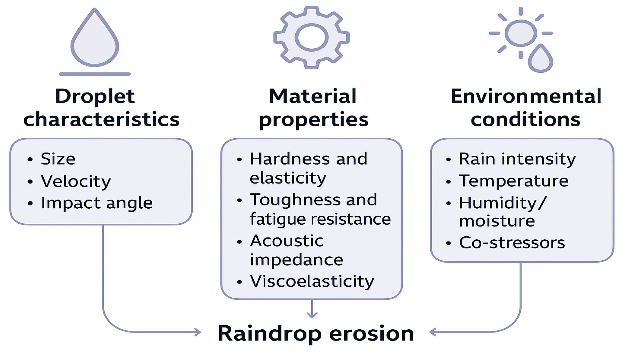 The severity of raindrop erosion on wind turbine blades is influenced by a complex interplay of droplet characteristics, material properties of the blades and their coating, and ambient environmental conditions. A conceptual framework linking droplet characteristics, material properties and environmental conditions to the progression of rain erosion is presented in Figure 4. This synthesis diagram integrates the key factors discussed above, illustrating how they interact to influence the degradation pathways of wind turbine blade coatings.