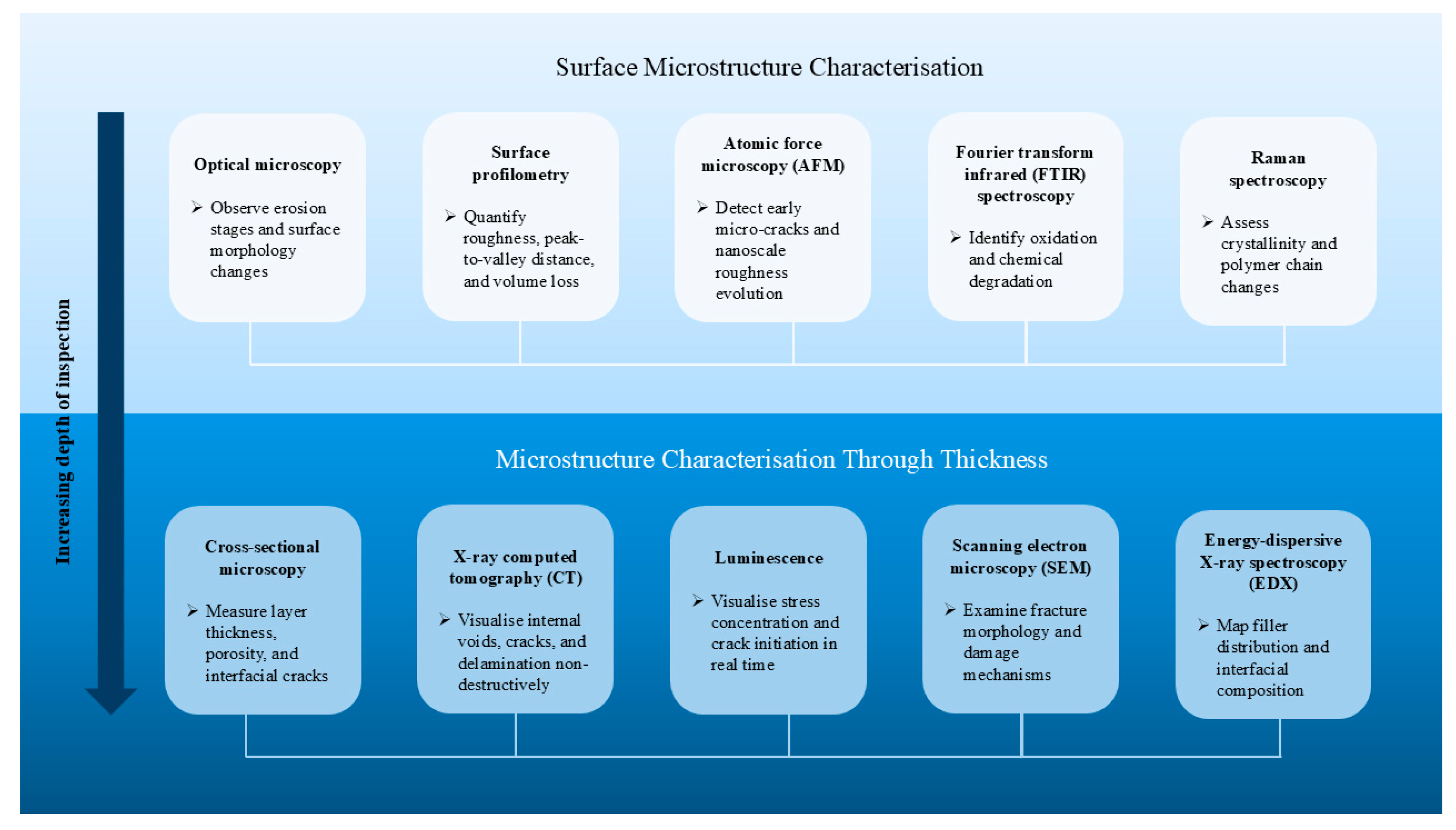 Ultimately, erosion resistance cannot be attributed to a single property such as hardness. Instead, it requires a holistic approach to material design that balances mechanical, acoustic, and chemical properties, with particular emphasis on viscoelasticity and adhesion. A coating that is highly rigid but lacks flexibility or strong adhesion may fail prematurely through cracking or delamination. Furthermore, protective coatings are typically applied as multi-layer systems comprising a primer, filler, and topcoat over the composite substrate [21]. The long-term performance of such systems depends not only on the intrinsic properties of individual layers but also on interfacial adhesion and acoustic compatibility across the coating stack. Mismatched impedance or weak bonding at interfaces can result in stress wave reflection and premature delamination, even when the coating materials themselves exhibit high erosion resistance [21].
