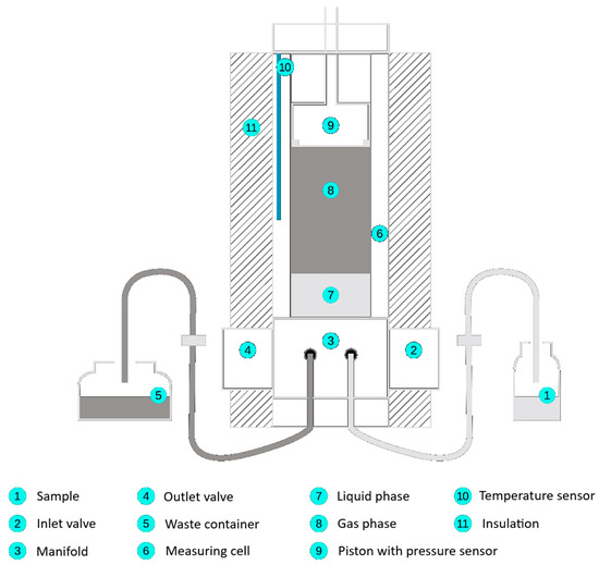 Figure 1) via an actuated piston. A pre-set number of rinse cycles are used to saturate the gas in the measuring cell with sample vapor. Upon conclusion of this conditioning operation, the piston is positioned to a depth corresponding to a chamber volume equal to 4 mL. The suction created by moving the piston up to a depth corresponding to 5 mL is responsible for pulling 1 mL of liquid sample into the measuring cell. During the filling process, sensed pressure is monitored to flag potential filling errors. Once the sensed pressure is found to be within 5 kPa of the (air-only) ambient pressure, which was recorded prior to rinsing, a second timer (t