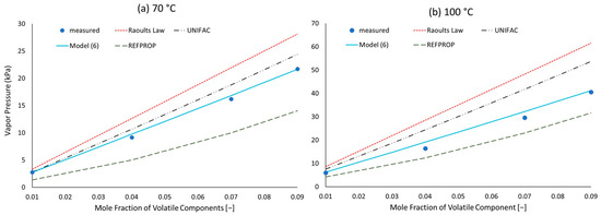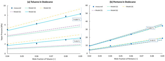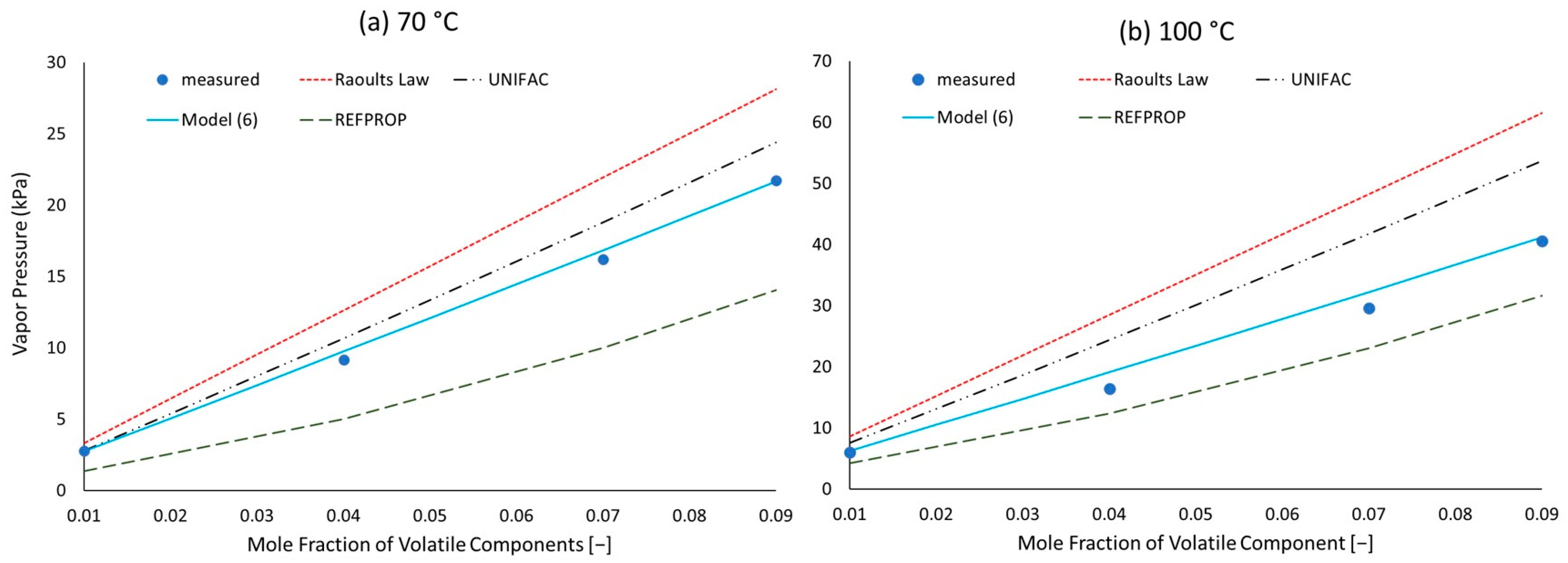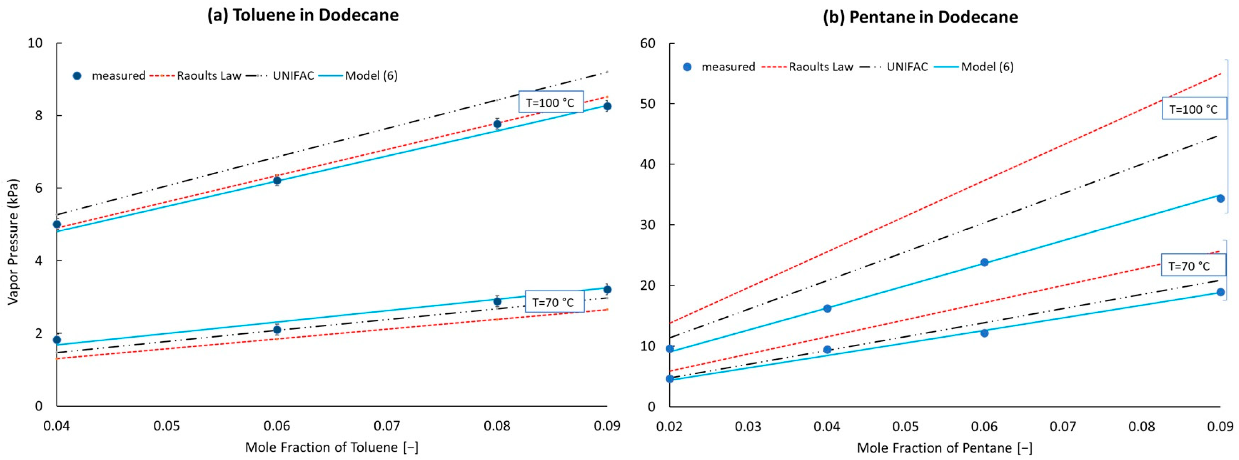 Ternary mixtures of n-pentane, toluene and n-dodecane were used as a first level of model validation. In these mixtures, the mole fractions of toluene and n-pentane were made equal to each other: 0.01, 0.04, 0.07 and 0.09. At minimum, the model developed in this work should predict the vapor pressure of these mixtures at 70 and 100 °C more accurately than any of the general models, regardless of its relative simplicity, because its parameters were trained specifically on n-pentane and toluene data. Extension of this model to higher temperatures, corresponding to the ambient-pressure bubble points, is somewhat more stressful, but each of the models considered in detail here employ the same vapor pressure curves of the pure components, so even here, the model developed in this work should be more accurate than Raoult’s Law and the correction to it based on UNIFAC-determined activity coefficients.