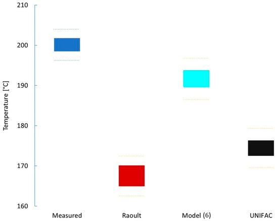 v distilled was compared with the measured pot temperature. Additionally, the measured temperature corresponding to the first visual observation of bubbles was recorded, as well as the bubble point, as predicted by the vapor pressure model. In this way, there is a band represented for both the measured and modeled temperatures.