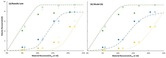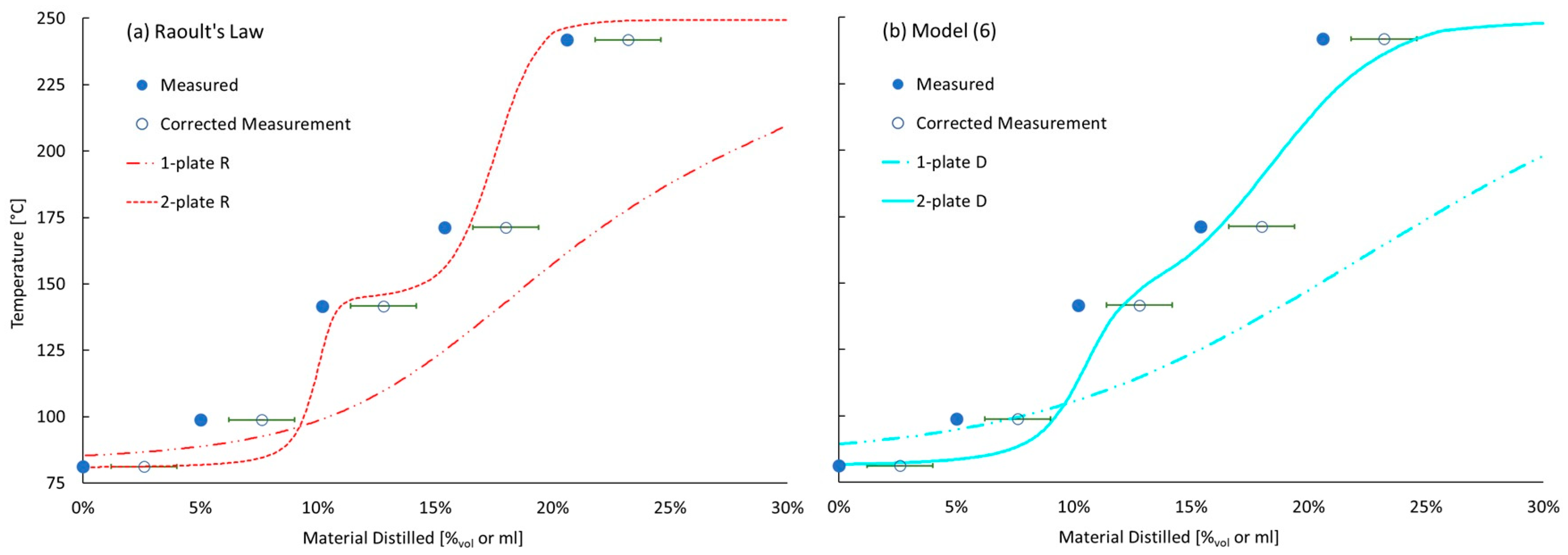 Idealized 1-plate and 2-plate distillations were completed for each experimentally distilled mixture and each vapor pressure model (this work and Raoult’s Law). The initial condition is 100 mL of a test mixture of a known composition at ambient temperature and pressure (Pamb), from which total moles are determined. This mixture is heated (or cooled) in increments of 0.001 K until its vapor pressure reaches (Pamb ± 0.001) kPa. At that point, for 1-plate distillations, 0.1%mol of material, with its composition determined by the modeled vapor phase, is removed from the system. The dew point of this drop is determined by cooling (or heating) the vapor in increments of 0.001 K until a liquid of that composition produces a vapor pressure of (Pamb ± 0.001) kPa. For 2-plate distillations, two vapor-phase compositions are tracked. The first one (the higher-temperature one) is determined by the temperature and composition of material in the pot; and the second one (the lower-temperature one) is determined by the temperature and composition of the first drop. The second bubble point temperature is equal to the first dew point temperature. This temperature, along with the composition of the first drop (as well as the first vapor phase), determines the composition of the second phase. At this point, for 2-plate distillations, 0.1%mol of material, with its composition determined by the second modeled vapor phase, is removed from the system. The dew point of this (second) drop is determined by cooling (or heating) the vapor in increments of 0.001 K until a liquid of that composition produces a vapor pressure of (Pamb ± 0.001) kPa. In each case the modeled (final) dew point is compared with experimentally measured condensate temperatures.