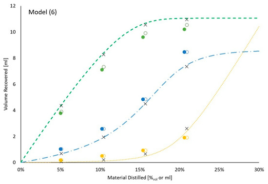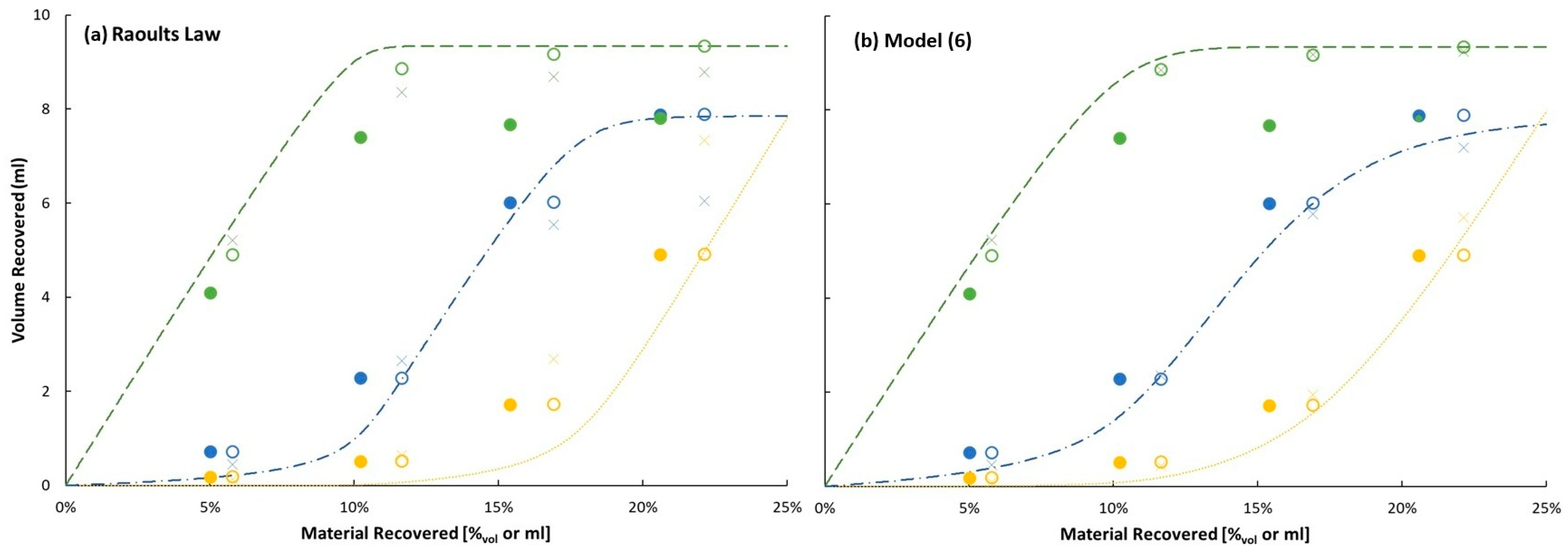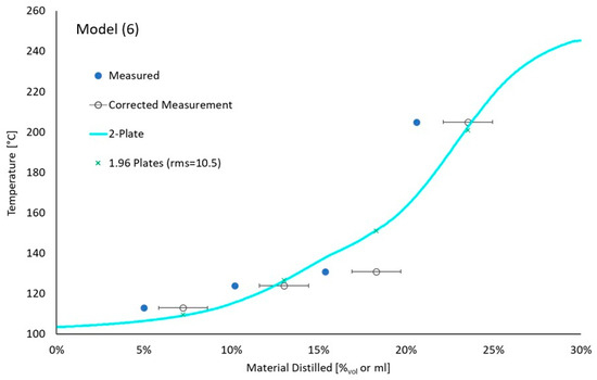 Larger dynamic holdup volumes suggest a higher degree of fractionation, because liquid that forms upstream of the inflection point on the condenser arm will drain toward the heat and re-vaporize (whether fully or partially) prior to blending back into the pot. Bounding assumptions of one or two theoretical plates of separation are assumed here for the purpose of comparing modeled distillations with measured distillation curves and distillate compositions. The theoretically estimated temperatures should be consistently higher than the measured temperatures (Tn) if they accurately reflect the actual temperature of a system with n%v ‘not-in-pot’, which includes dynamic holdup volume and collection volume, instead of n%v collected.