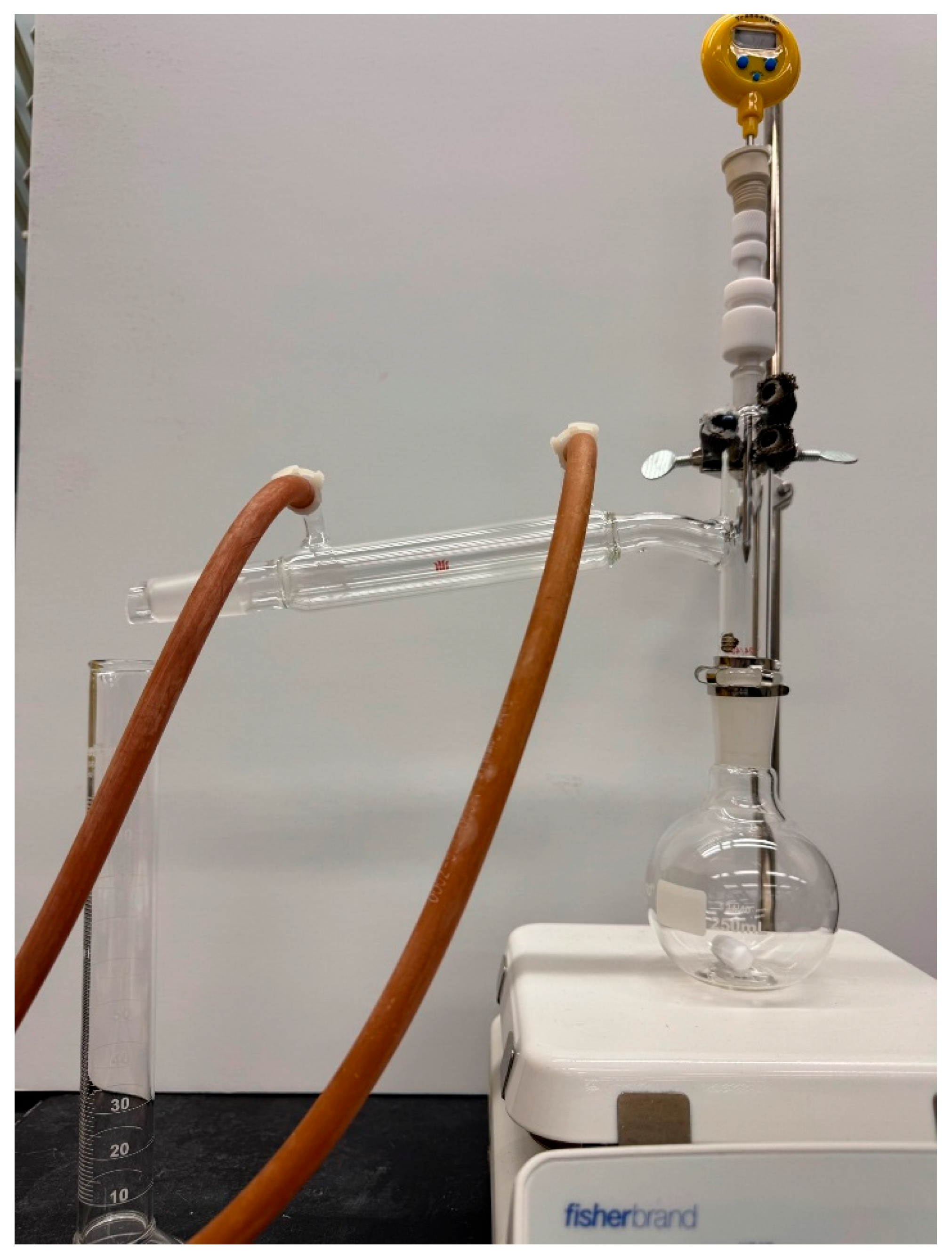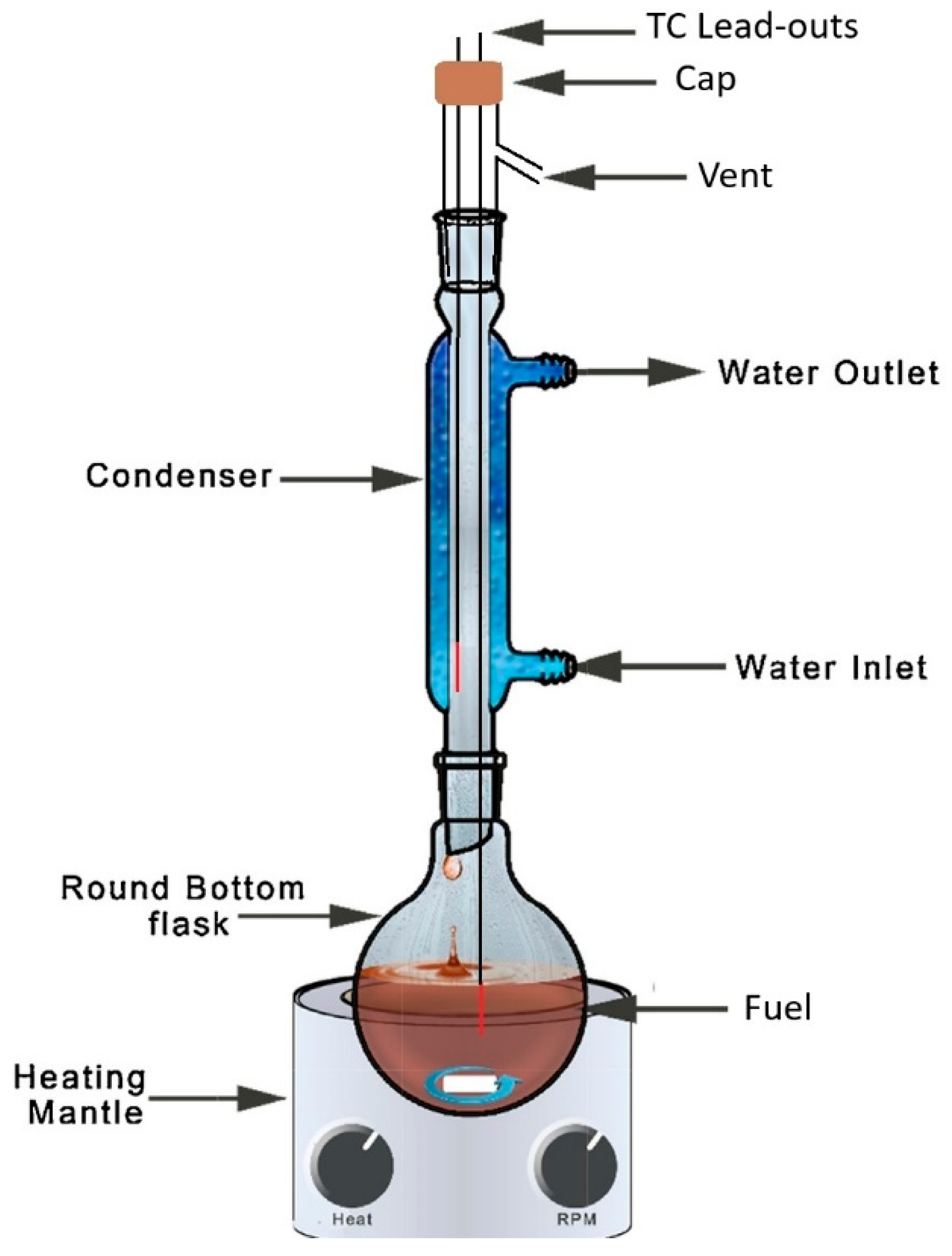 Figure 2) above the surface of the boiling liquid and below the condenser. In another experiment, 100 mL of a mixture made from A (10.36 g of cyclohexane, 10.04 g of o-xylene and 90.93 g of n-tetradecane) or B (10.02 g of isooctane, 10.01 g of o-xylene and 79.96 g of n-tetradecane) was distilled according to the method described as ASTM D86. A brief description of this experiment is provided in this
