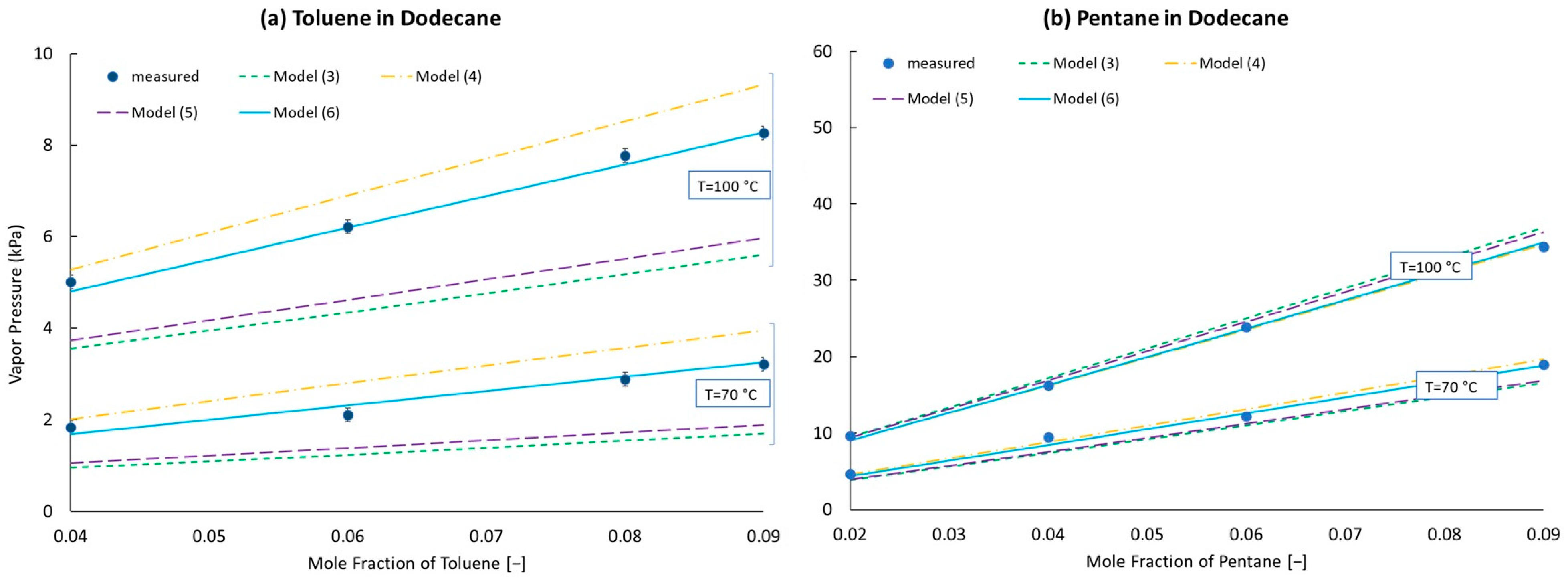 Binary mixtures of n-pentane or toluene in n-dodecane, each at 4 different blending ratios and heated to 70 or 100 °C, were used to determine the tuning parameter(s), . Both sets of binary mixtures included 0.04, 0.06 and 0.09 mole fractions of the lighter component, while the n-pentane/n-dodecane set also included one mixture with a 0.02 mole fraction of n-pentane, and the toluene/n-dodecane set also included one mixture with a 0.06 mole fraction of toluene. A large difference in volatility was deliberately chosen to minimize the impact of errors stemming from the vapor–liquid equilibrium of the solvent, focusing instead on a single volatile component at low mole fractions. For example, the liquid mixture containing 0.04 mole fraction toluene produces a vapor at 100 °C that consists of at least 60% toluene, with wide variation depending on which model is used to predict the component vapor pressures.