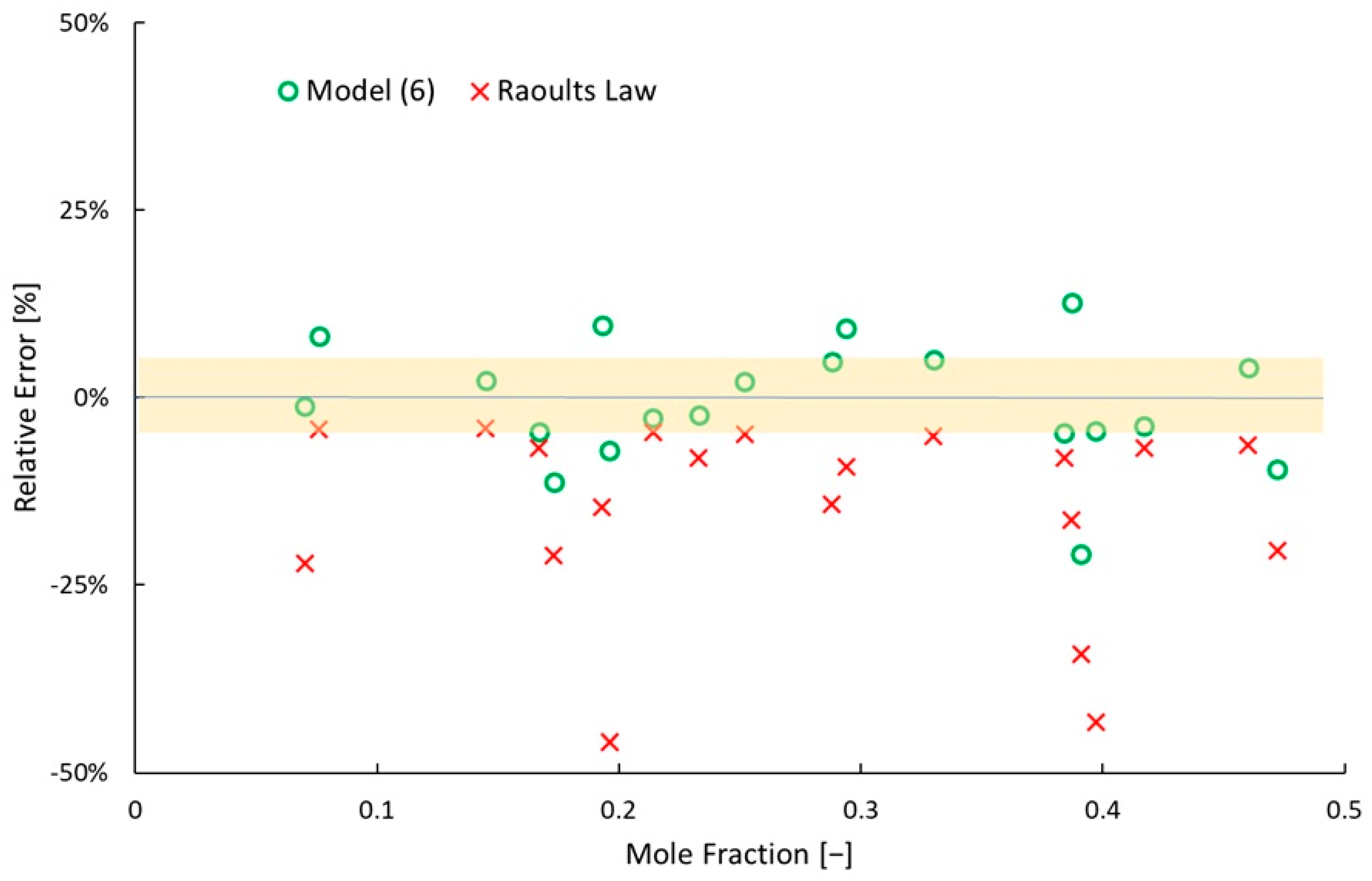 39]. Although none of the ninety (T, P) vapor–liquid equilibrium points they measured satisfy our predetermined filter criteria, the dataset serves as a valuable benchmark for assessing how our model performs when applied to systems clearly outside the training set’s range. For the record, our predetermined filter criteria were non-associated components, a <0.10 mole fraction of the volatile component(s), which we call solute, a >100 K difference between the solute and solvent’s normal boiling points, and a mixture vapor pressure between 1.5 and 101.3 kPa. Their study involved five sets of binary mixtures involving n-nonane, n-octane, methylcyclohexane and methylcyclopentane and three fixed temperatures (120, 160, 200 °C). We selected the points at 120 °C to minimize the confounding effects of real gas behavior, as model (6) does not address heterogeneous intermolecular attractions/repulsions in the gas phase. Three older datasets by different authors were also evaluated, but the data contained in those reports, relative to Raoult’s Law predictions, showed deviations much different from our observations, leading us to question whether we properly understand the experiment they conducted.